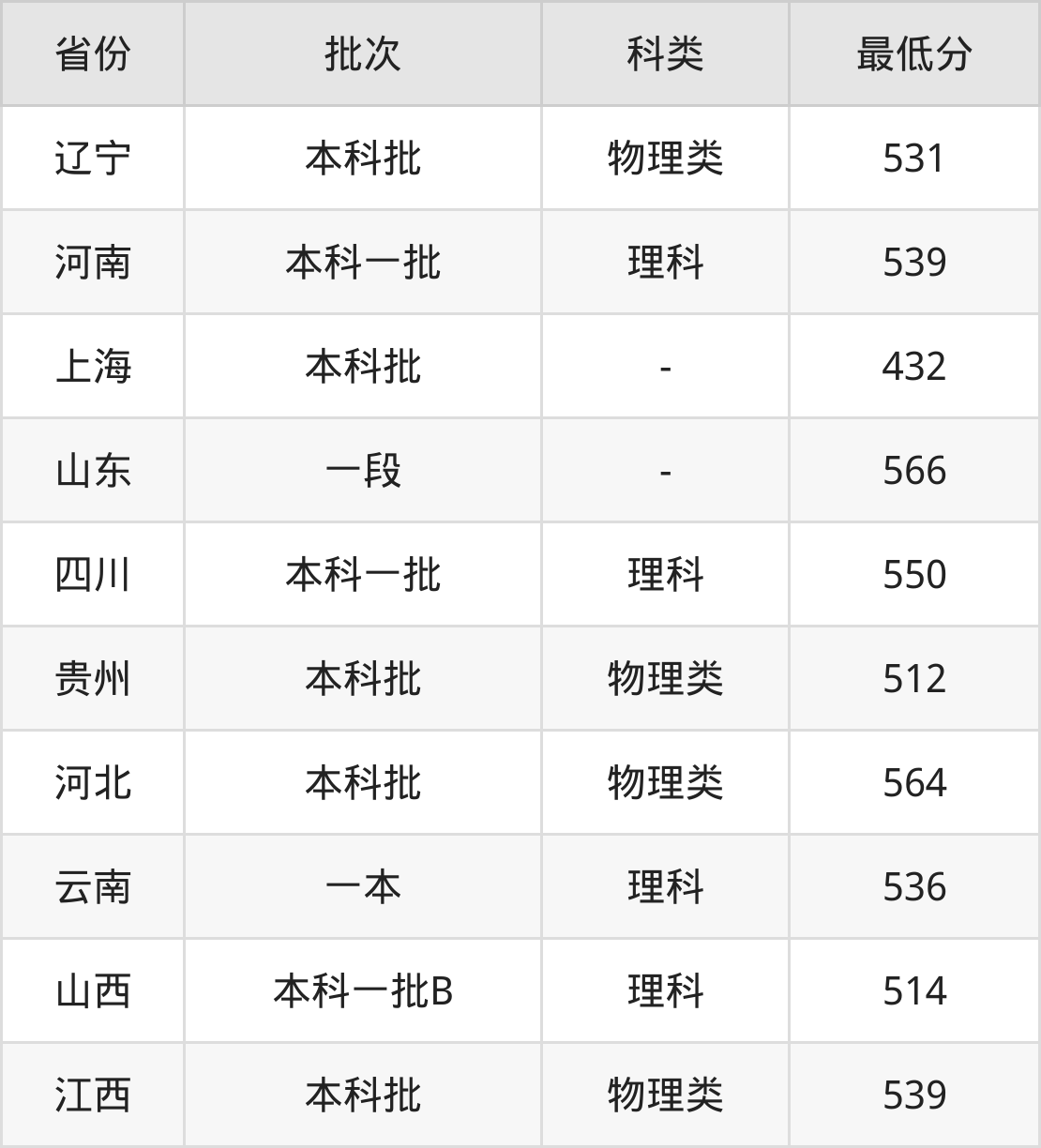 | 批次 | 科类 | 最低分 | 位次 |