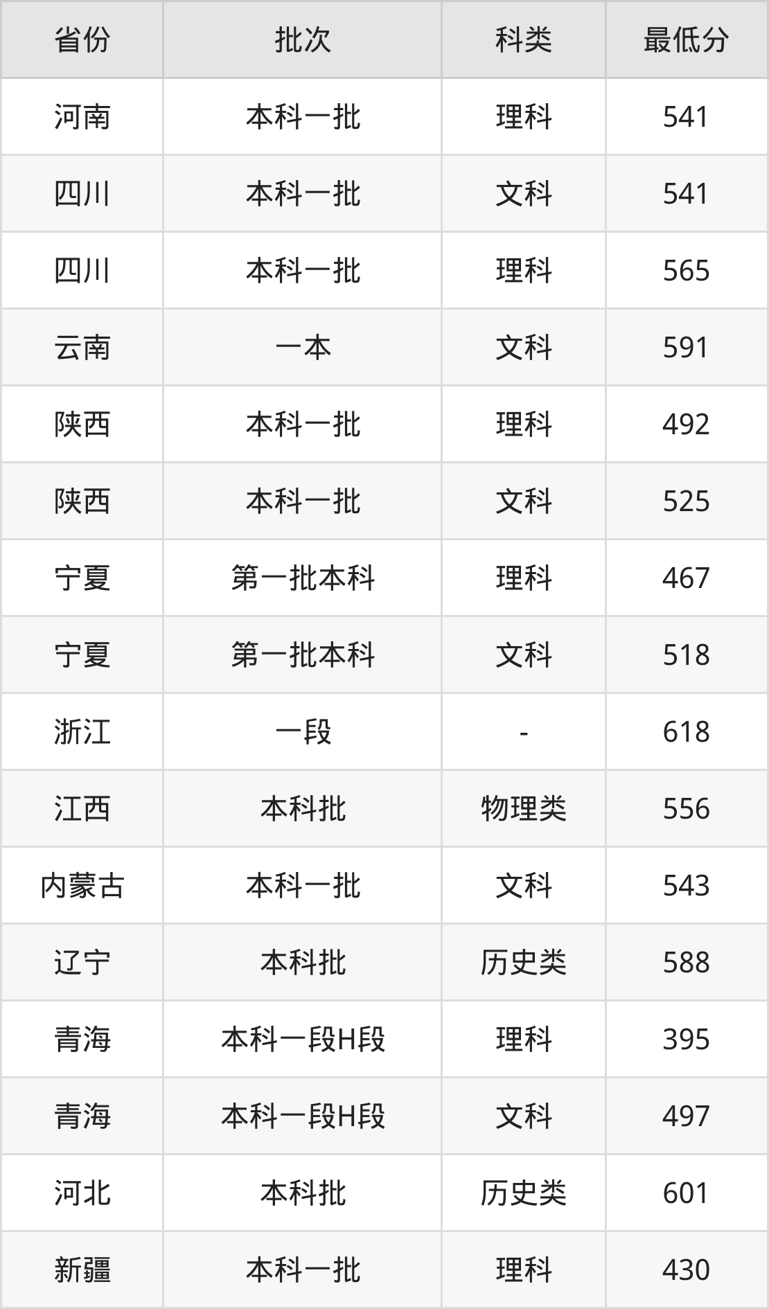 | 批次 | 科类 | 最低分 | 位次 |