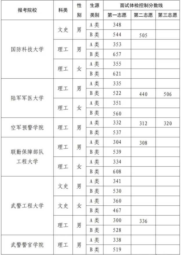 各军队院校军检分数线一览表:
