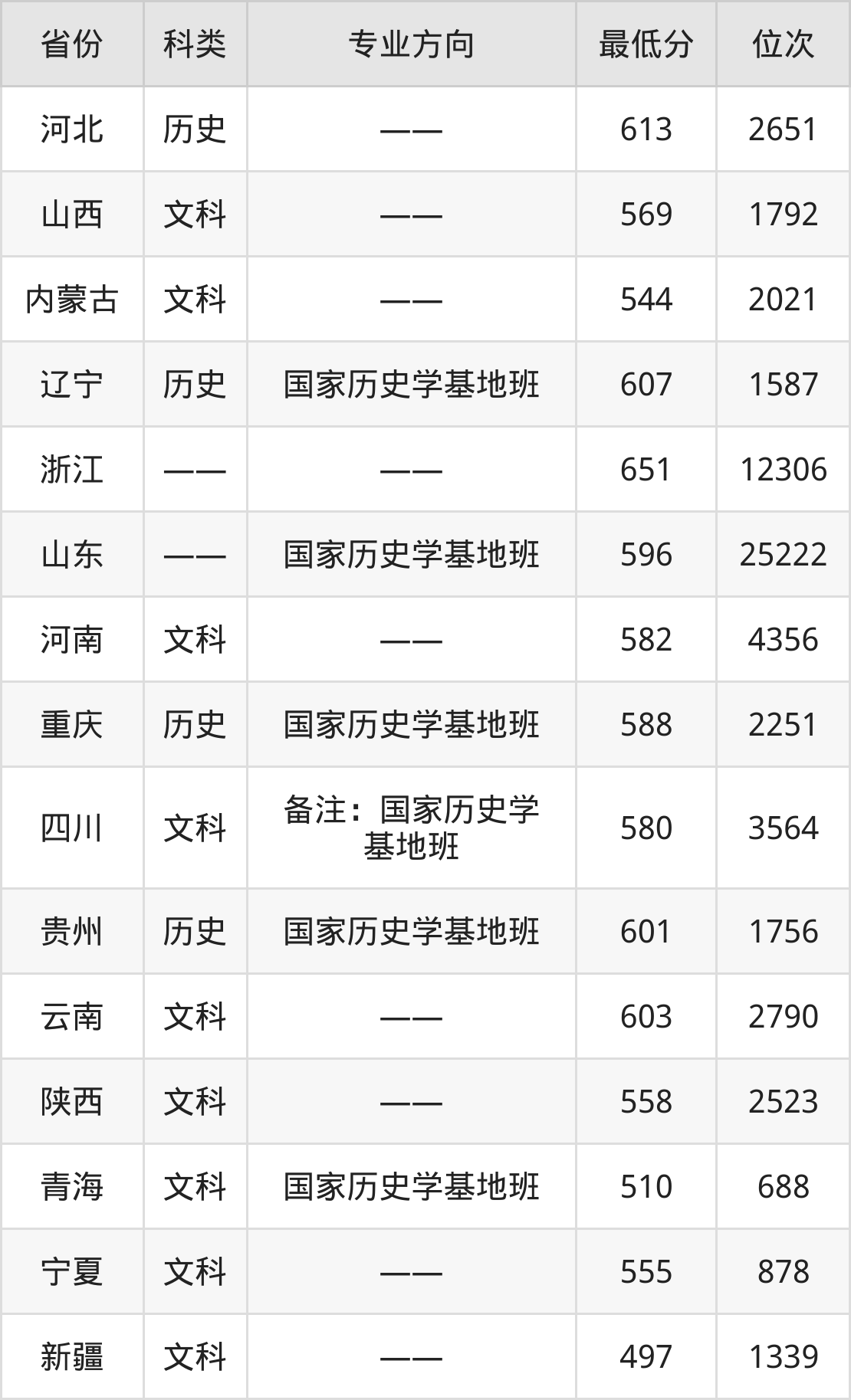 下面是2024年云南大学历史学专业录取分数线一览表: