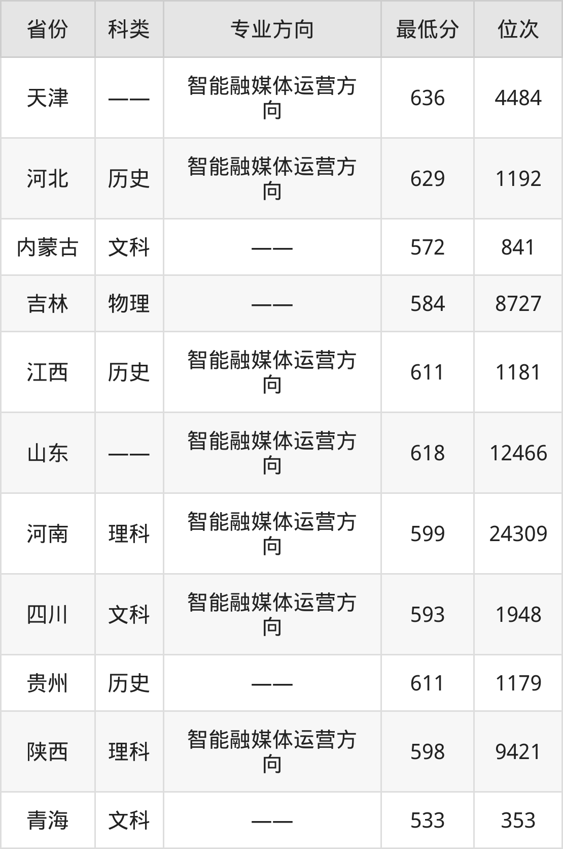 2024年中国传媒大学网络与新媒体专业在全国11个省市招生,录取最低分从533分到636分不等,下面老师为大家具体介绍。