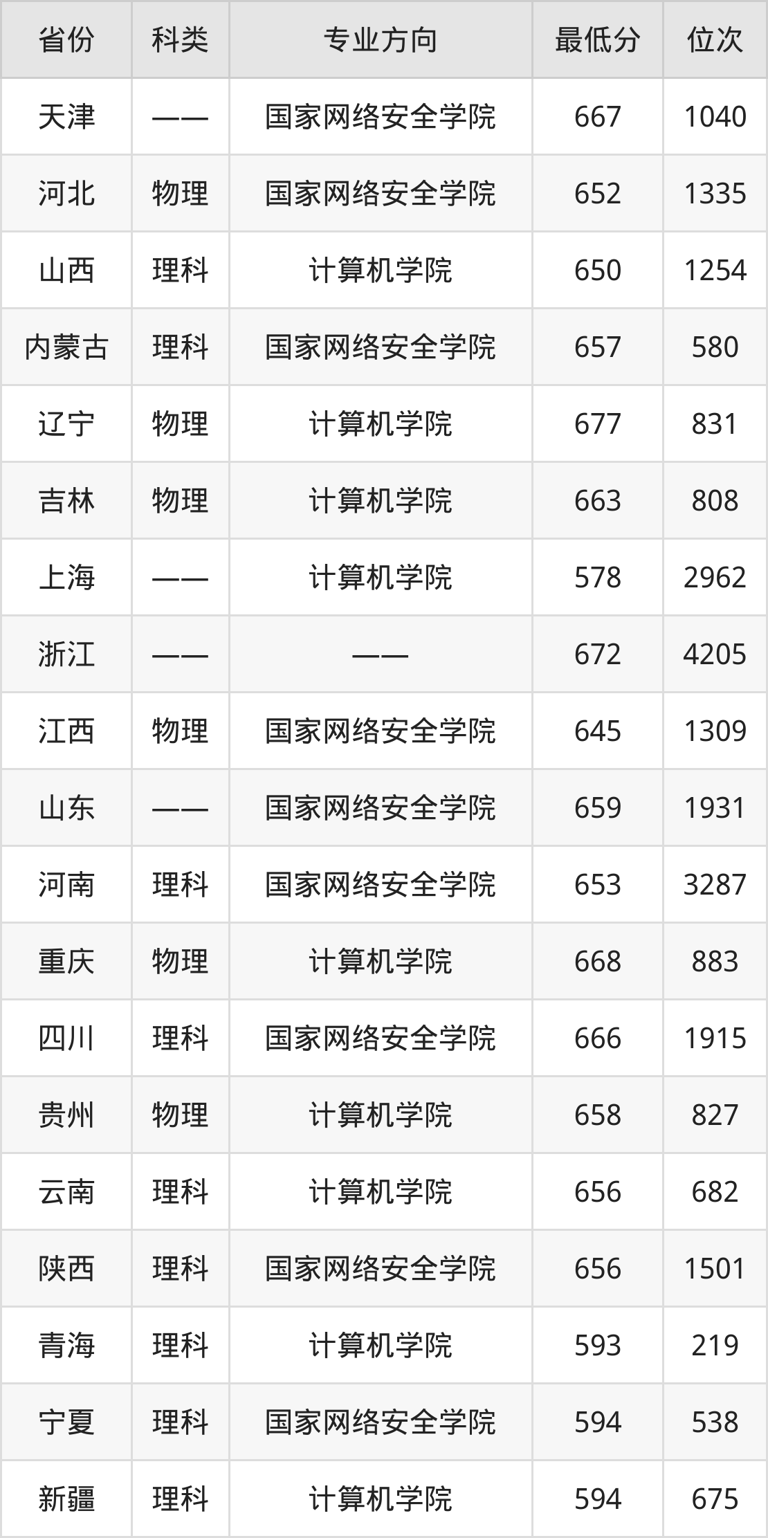 下面是2024年武汉大学计算机类专业录取分数线一览表: