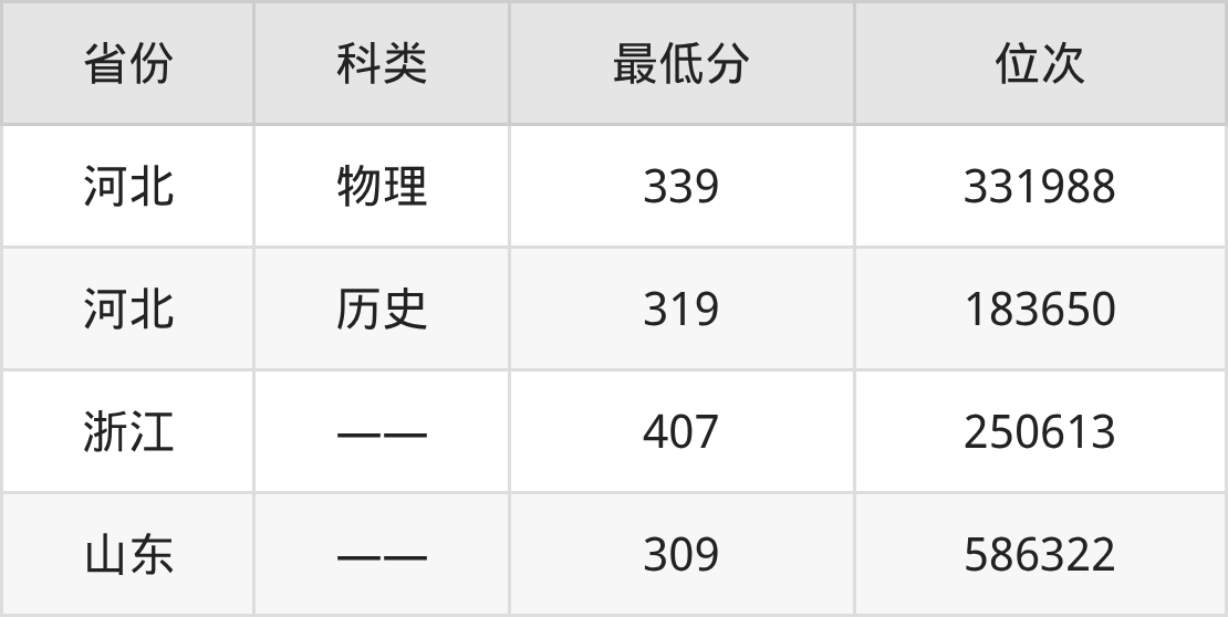 2025年江西科技职业学院康复治疗技术专业在河北录取最低分:物理组是339分,对应位次排名是331988名;历史组是319分,对应位次排名是183650名。
