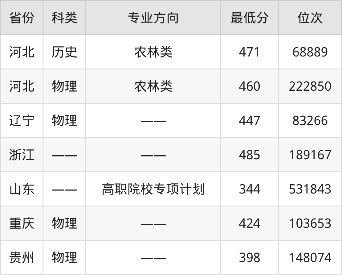 2025年山东畜牧兽医职业学院宠物医疗技术专业在贵州录取最低分:398分,对应位次排名是148074名。