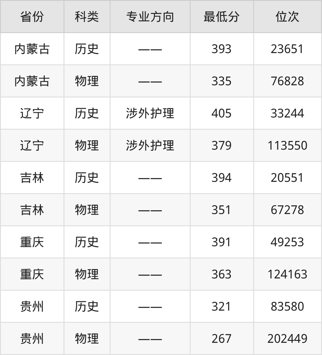 2025年铁岭卫生职业学院护理专业在重庆录取最低分:历史组是391分,对应位次排名是49253名;物理组是363分,对应位次排名是124163名。