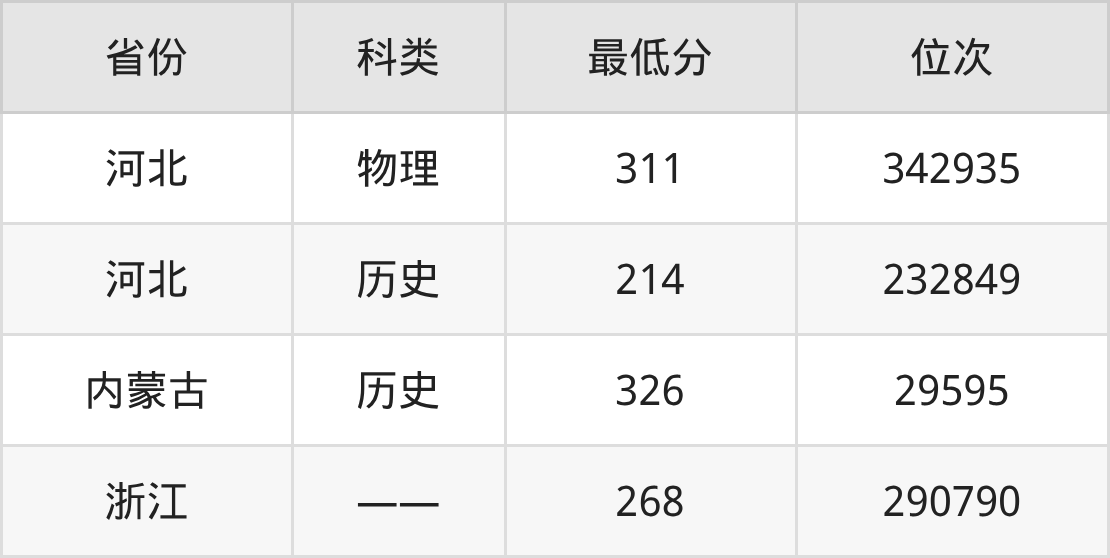 2025年四川应用技术职业学院大数据与财务管理专业在河北录取最低分:物理组是311分,对应位次排名是342935名;历史组是214分,对应位次排名是232849名。