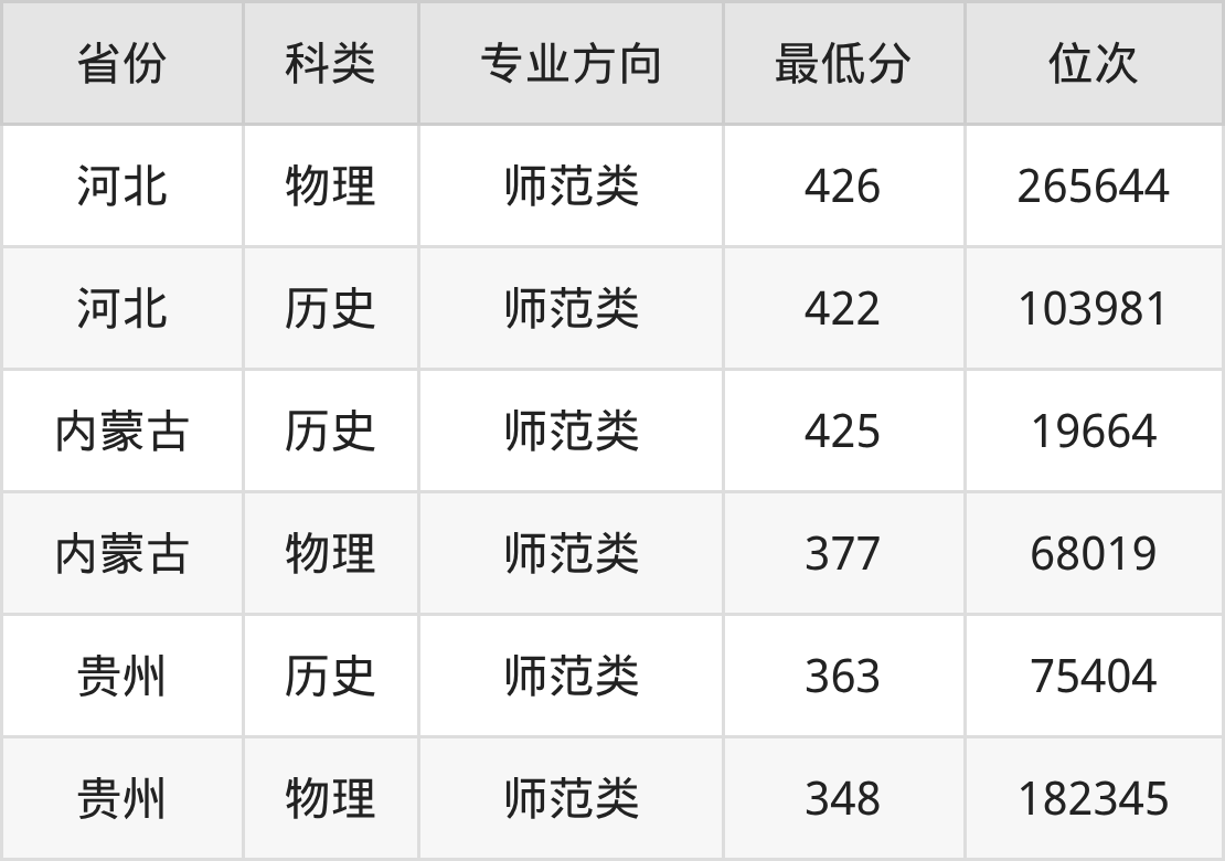 2025年呼和浩特职业技术大学小学教育专业在贵州录取最低分:历史组是363分,对应位次排名是75404名;物理组是348分,对应位次排名是182345名。