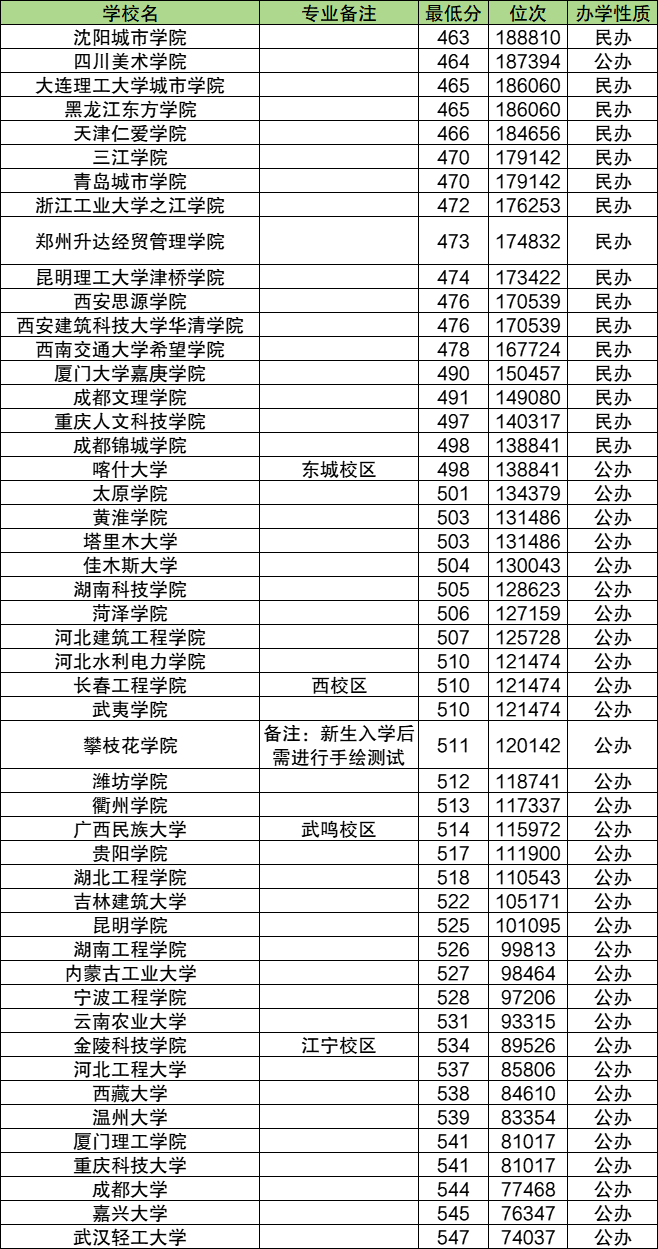 在理科二本招生的建筑学大学有49所,录取分数线最低的是沈阳城市学院(民办),2024年最低分463分;录取分数线最高的是武汉轻工大学,2024年最低分547分。最低分公办二本建筑学大学为四川美术学院,2024年最低分464分。