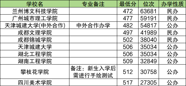 在文科二本招生的建筑学大学有9所,录取分数线最低的是兰州博文科技学院(民办),2024年最低分472分;录取分数线最高的是四川美术学院,2024年最低分517分。最低分公办二本建筑学大学为天津城建大学(中外合作),2024年最低分482分。