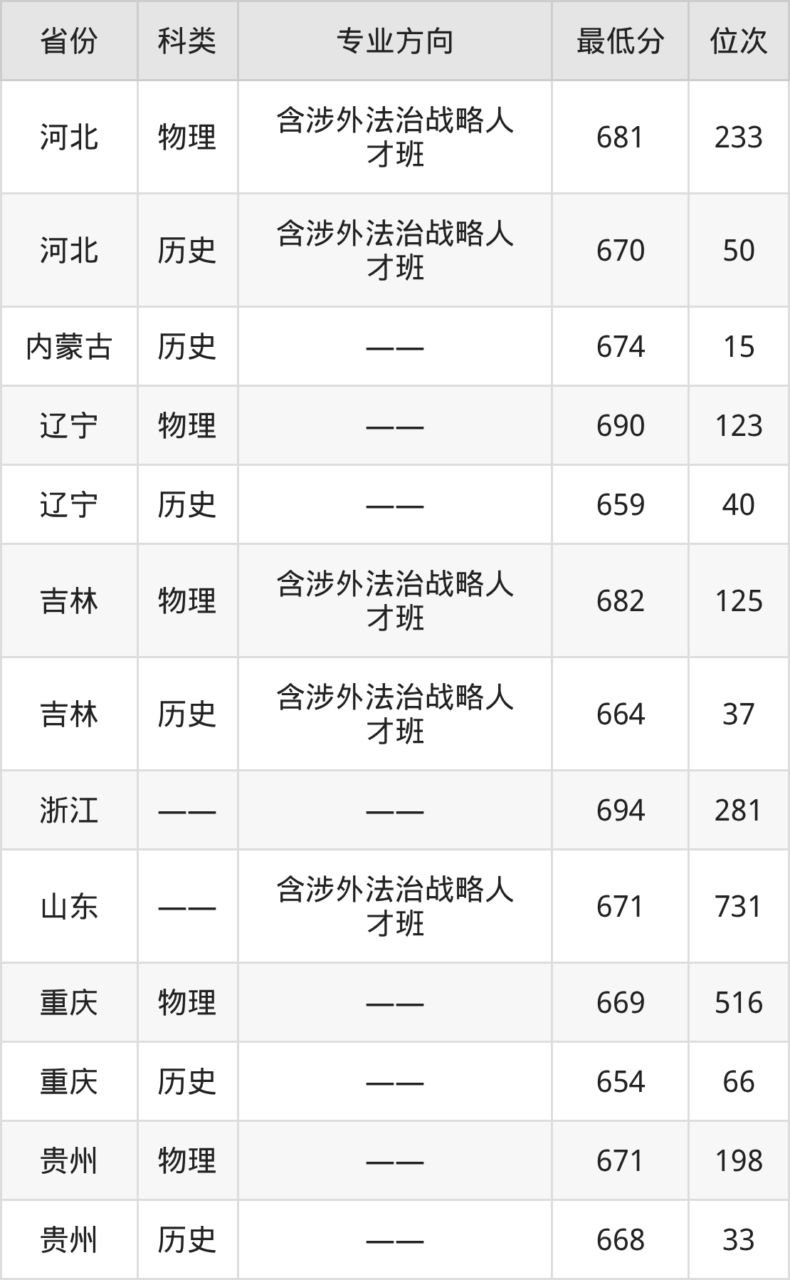 2025年中国人民大学法学专业在重庆录取最低分:物理组是669分,对应位次排名是516名;历史组是654分,对应位次排名是66名。