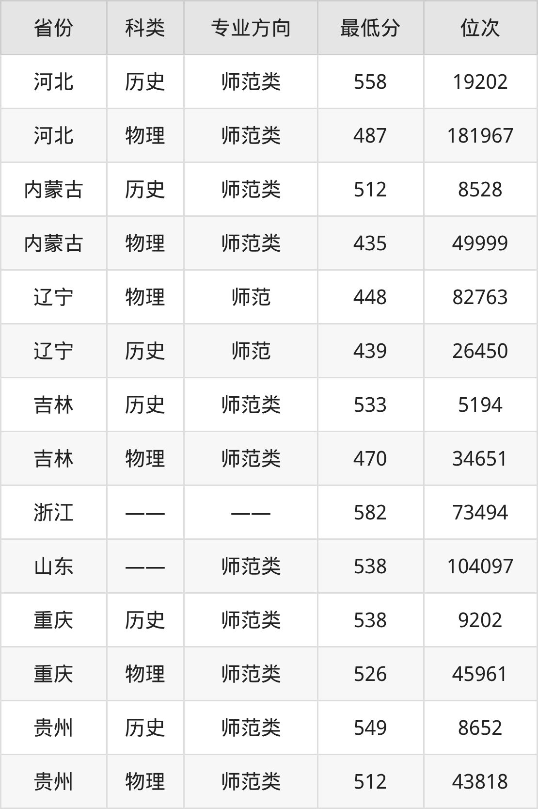 2025年海南师范大学教育学类专业在贵州录取最低分:历史组是549分,对应位次排名是8652名;物理组是512分,对应位次排名是43818名。