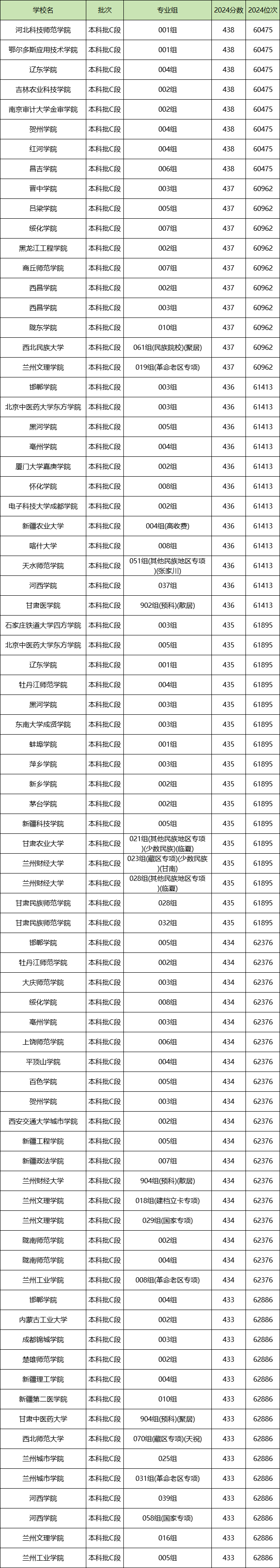 最低位次院校专业组为河西学院(058组)、兰州文理学院(016组)、兰州工业学院(005组)等,2024年录取位次是62886名,录取分数线是433分。