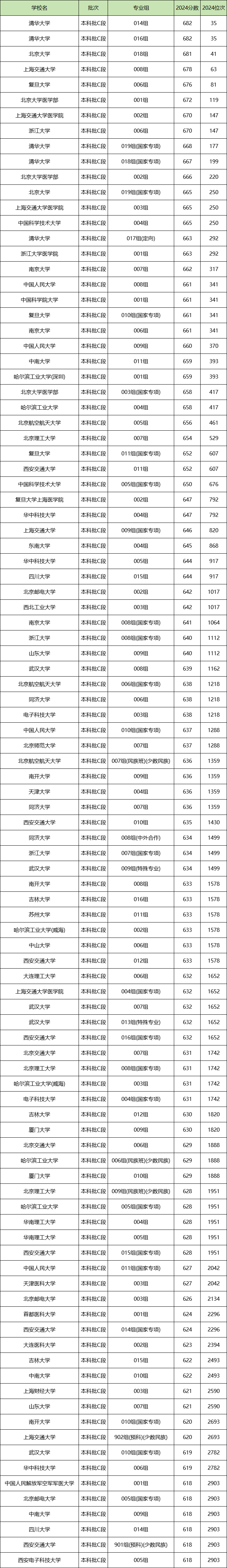 最低位次院校专业组为四川大学(014组)、西安交通大学(901组)、西安电子科技大学(005组),2024年录取位次是2903名,录取分数线是618分。