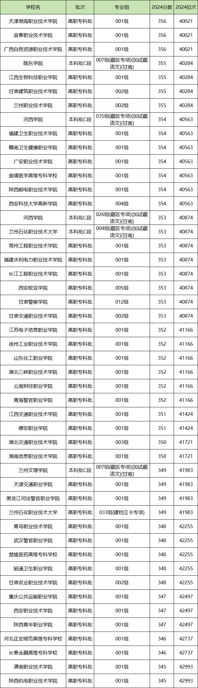 4万-4.3万名范围内,最高位次院校专业组为天津渤海职业技术学院(001组)、宜春职业技术学院(001组)等,2024年录取位次是40021名,录取分数线是356分;