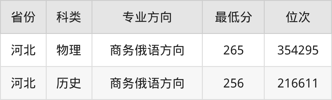 2025年河北外国语学院应用俄语专业在河北录取最低分:物理组是265分,对应位次排名是354295名;历史组是256分,对应位次排名是216611名。