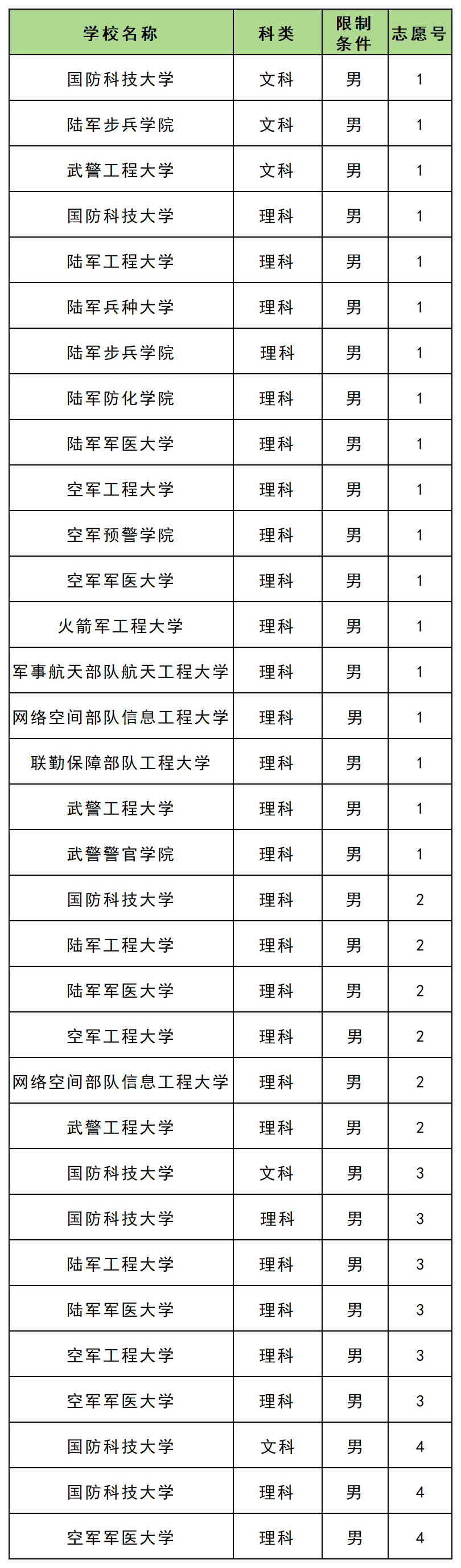 2025年新疆军校男生最低面试体检资格理科分数线是421分,对应分数线最低的学校是网络空间部队信息工程大学;文科分数线是455分,对应学校是国防科技大学。各学校最低分如下。