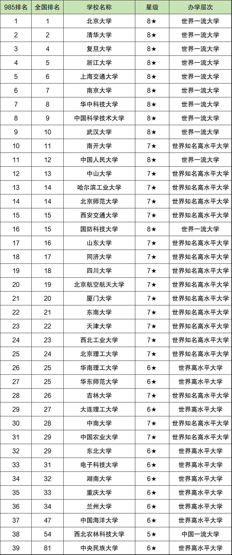 39所985大学排名完整版: