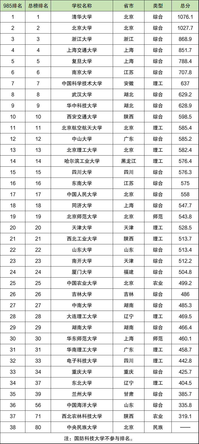 清华大学:985大学第一名,1076.1分;
