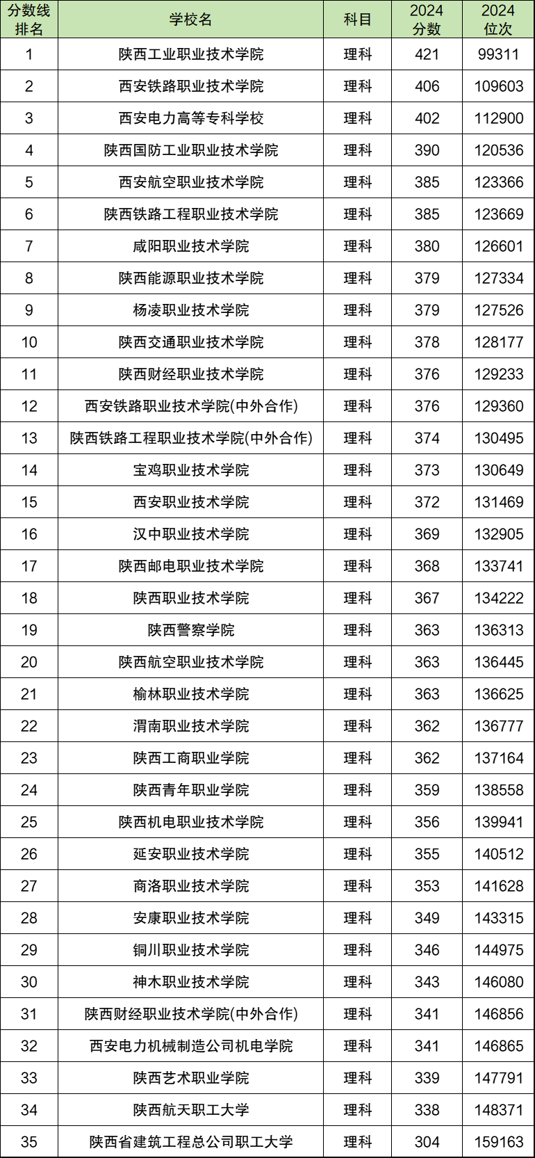 2024年陕西公办专科大学录取分数线排名(理科):