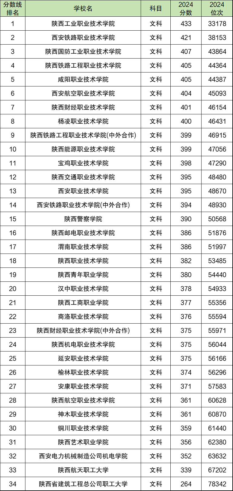 2024年陕西公办专科大学录取分数线排名(文科):
