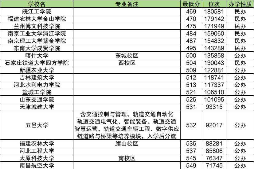 二本交通工程分数线排名前五的还有:545分的太原科技大学、537分的河北工程大学、535分的福建农林大学、532分的五邑大学。