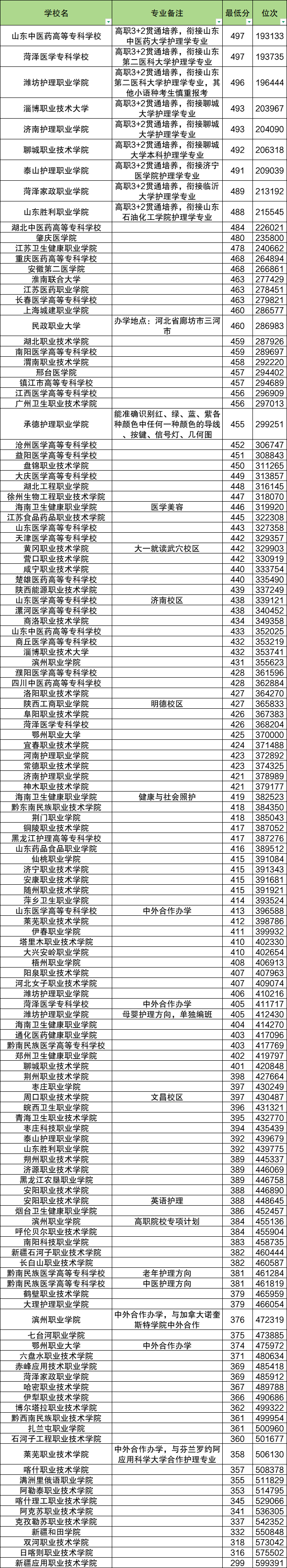 公办专科护理专业收分最高的学校是山东中医药高等专科学校,2025年最低分是497分,超专科批次线347分。