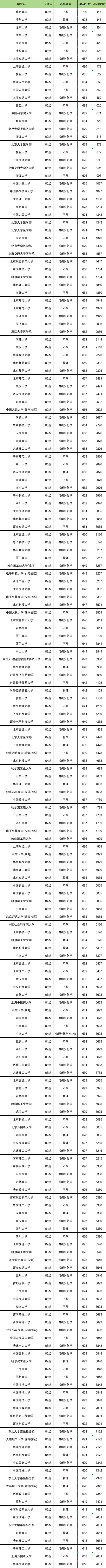 2024年物化生一本大学录取分数线排名top200名单一览表: