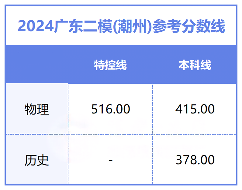2023广东二模官方划线已公布,本科线物理类416分,历史类405分;特控线物理类505分,历史类502分。对比去年广东二模的数据,特招线和本科线都有所下降。