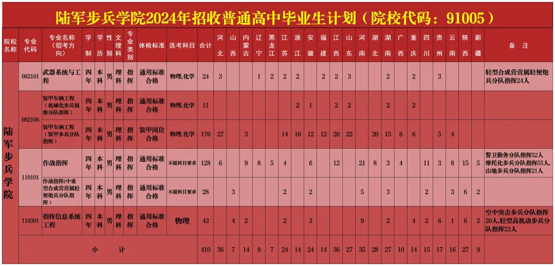 目前陆军步兵学院2025年招生简章暂未出炉,本文会在官方公布后及时更新,下面附上2024年招生信息暂供参考: