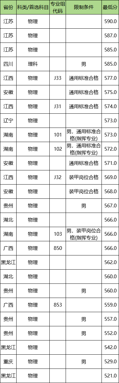 2024年陆军步兵学院在各省的招录分数都不一样,具体如下: