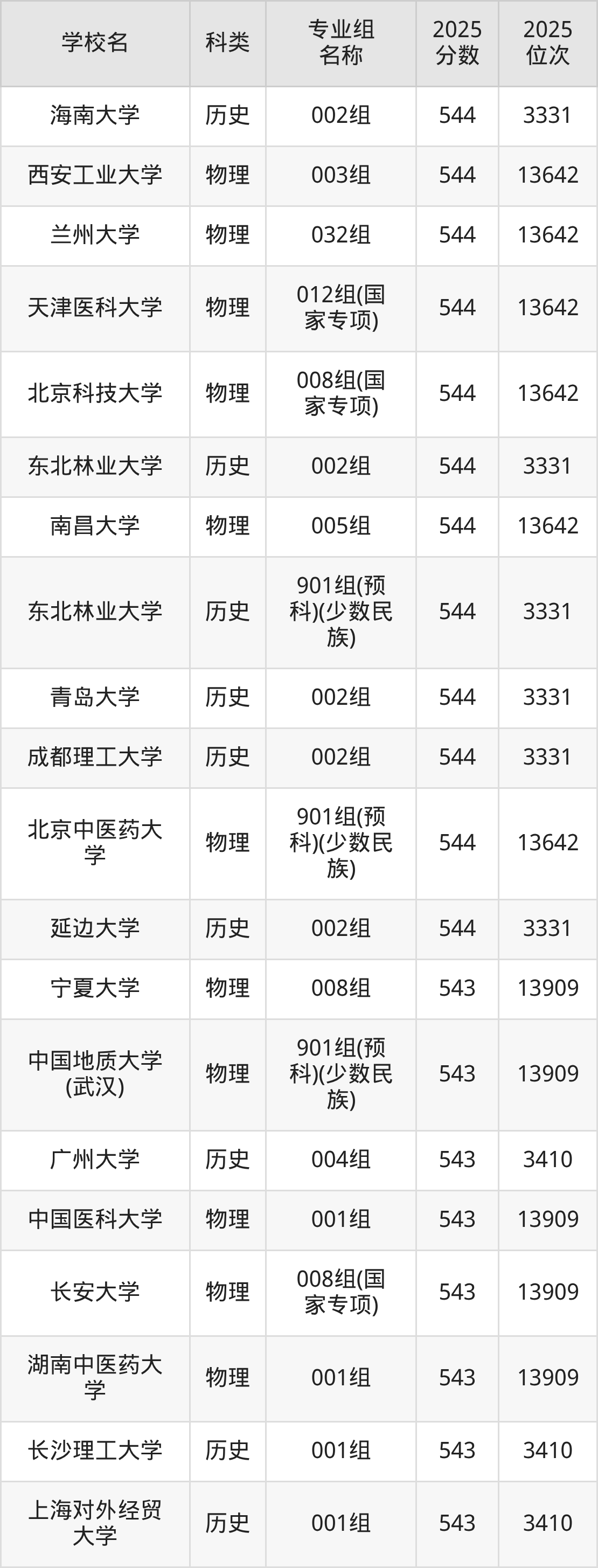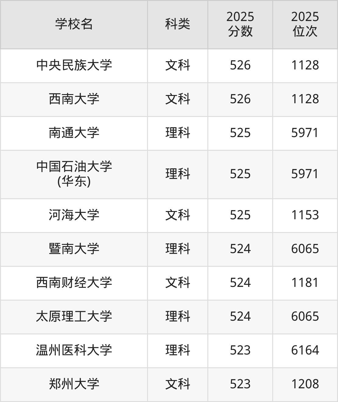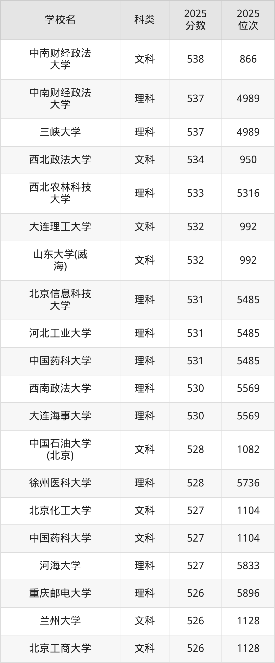 除上述院校外,545分可上的公办一本大学还有河南财经政法大学(494分,位次2170名)、广西大学(481分,位次10385名)。