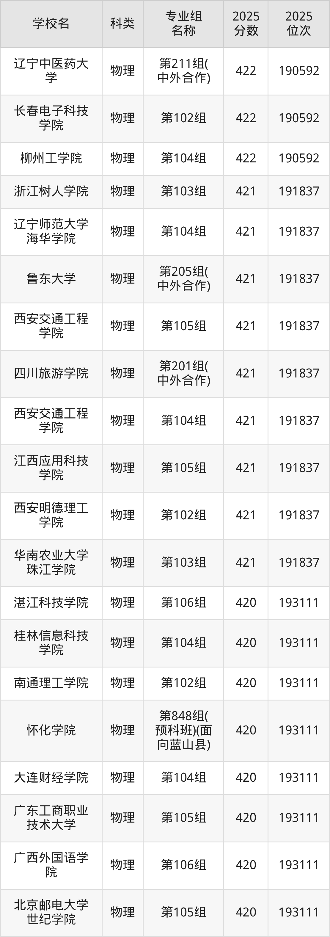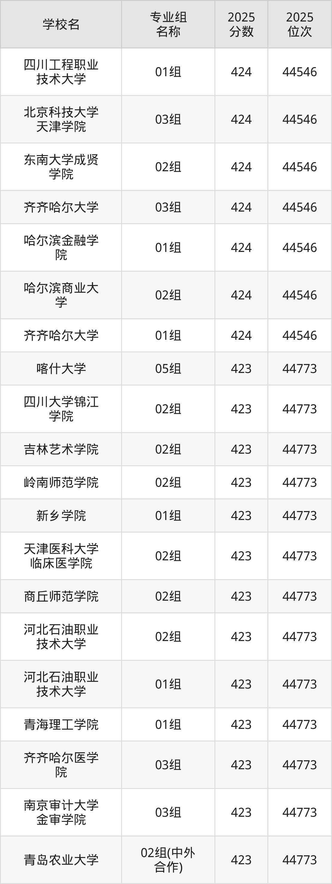 除上述院校外,424分可上的公办本科大学还有西安航空学院(第206组(中外合作)418分,位次195646名)、北华大学(第211组(中外合作)413分,位次201862名)。