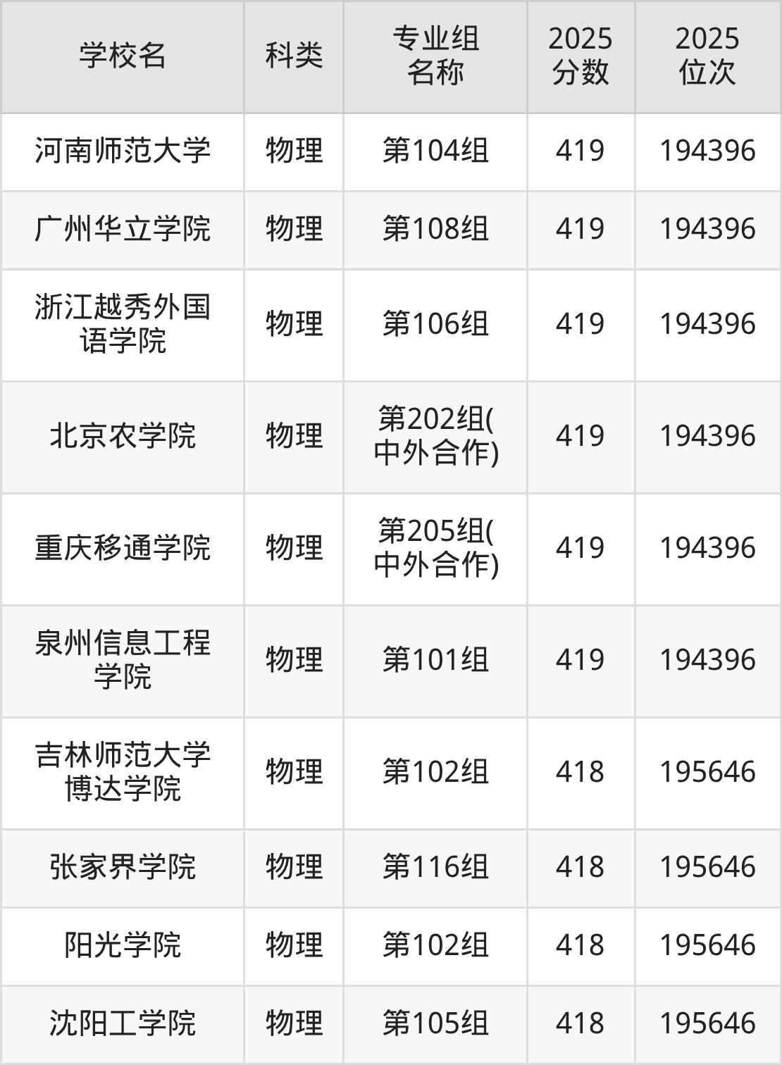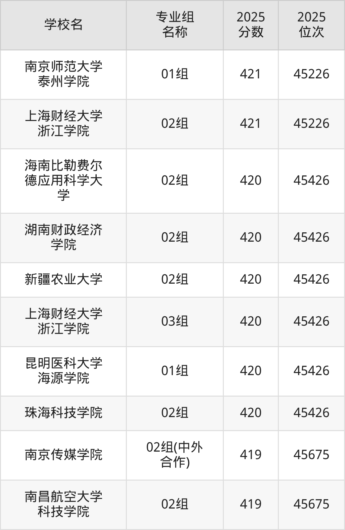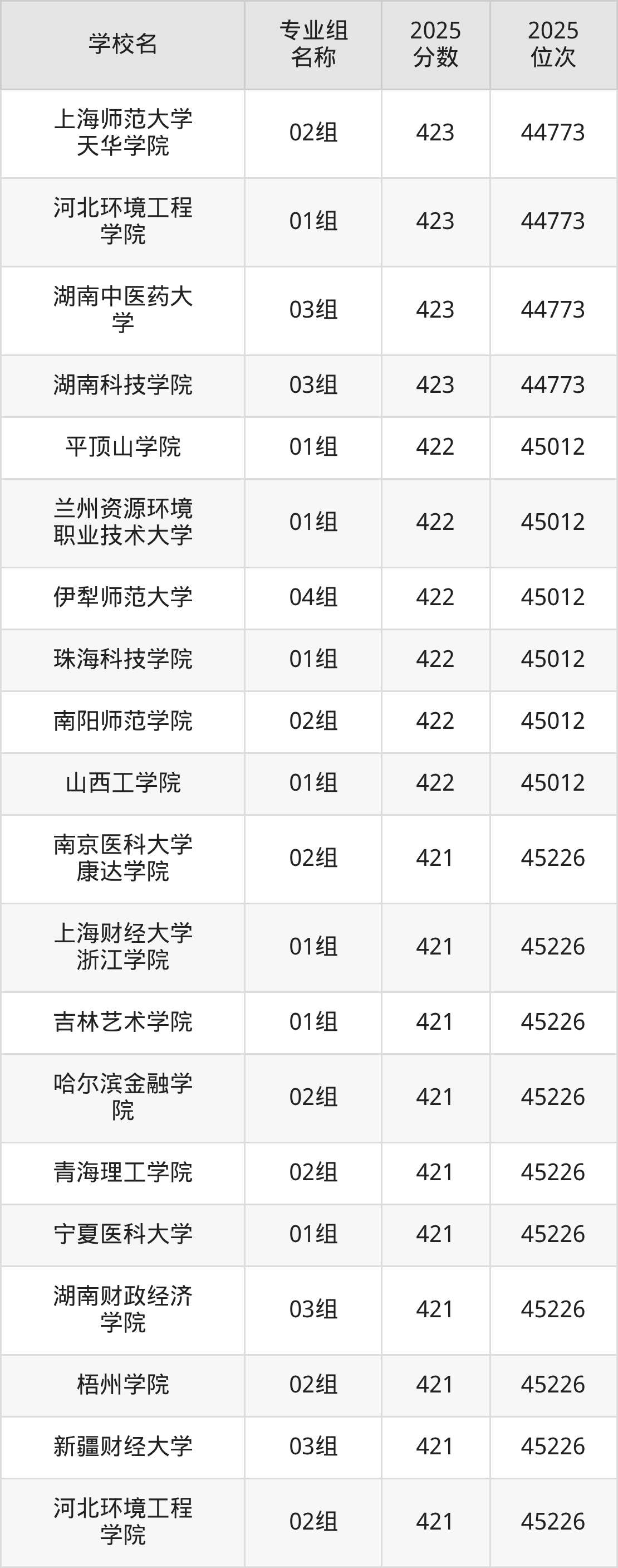 而民办大学录取位次排名最低的是天津商业大学宝德学院(402分),其2025最低位次为49276名。