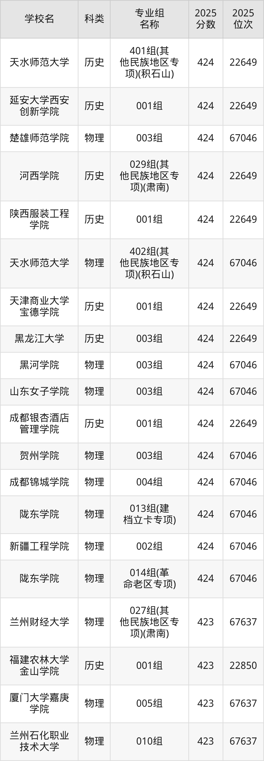2025年甘肃历史类本科线为412分,424分能上的本科大学共计116所,其中公办大学录取位次排名最低的是陇南师范学院(004组(藏区专项)(少数民族)(甘南)412分,位次25282名),即代表考生省排名位次在25282名及以内就可以报考公办本科。