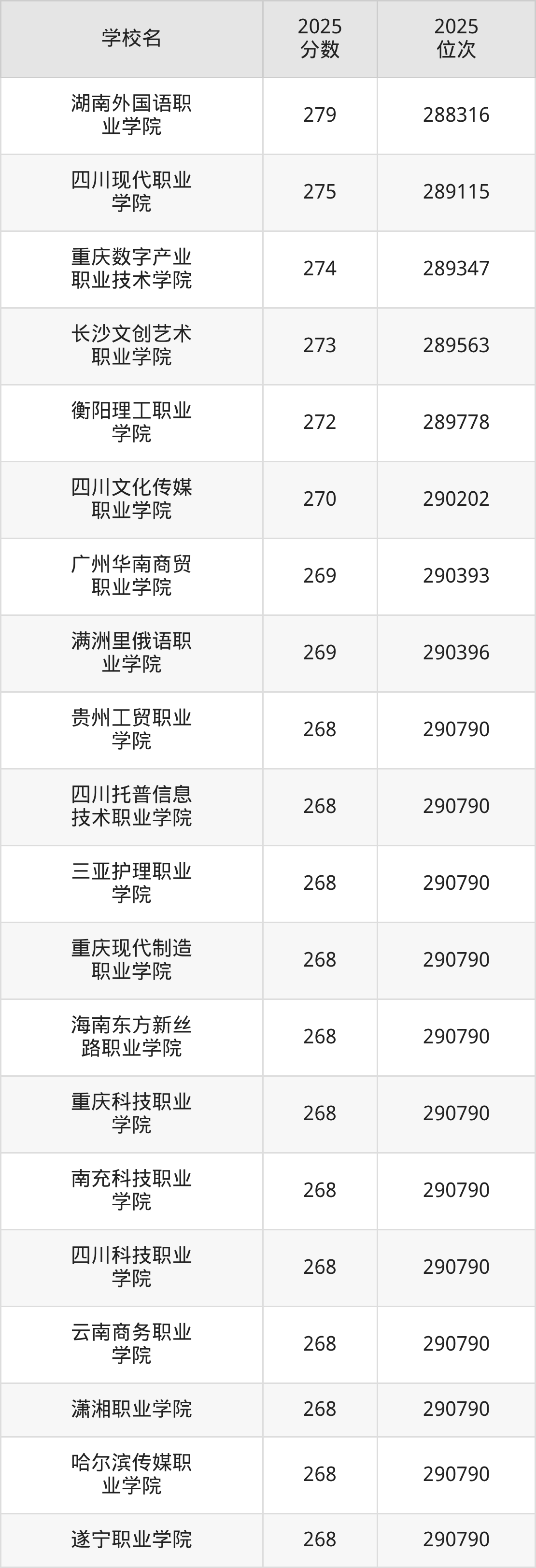 而位次最低的民办院校有四川文轩职业学院、广西英华国际职业学院、广西工程职业学院、重庆艺术工程职业学院,分数为268分,对应最低位次排名为290790名。