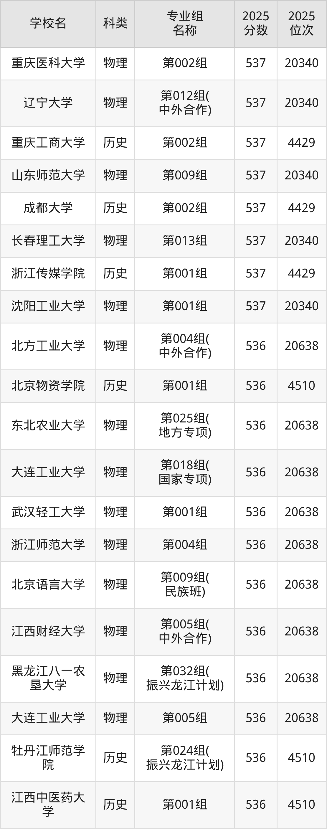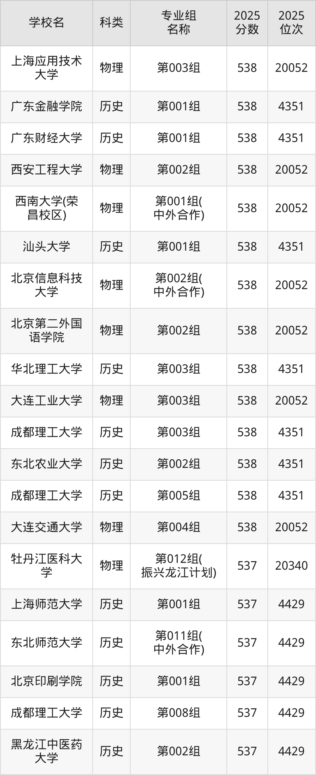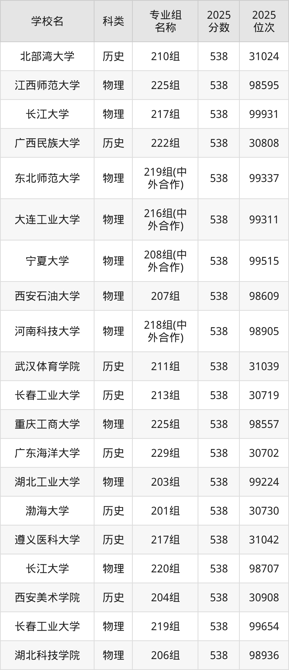 除上述院校外,538分可上的公办本科大学还有大连民族大学(第005组499分,位次32535名)、甘肃医学院(第001组491分,位次35295名)。