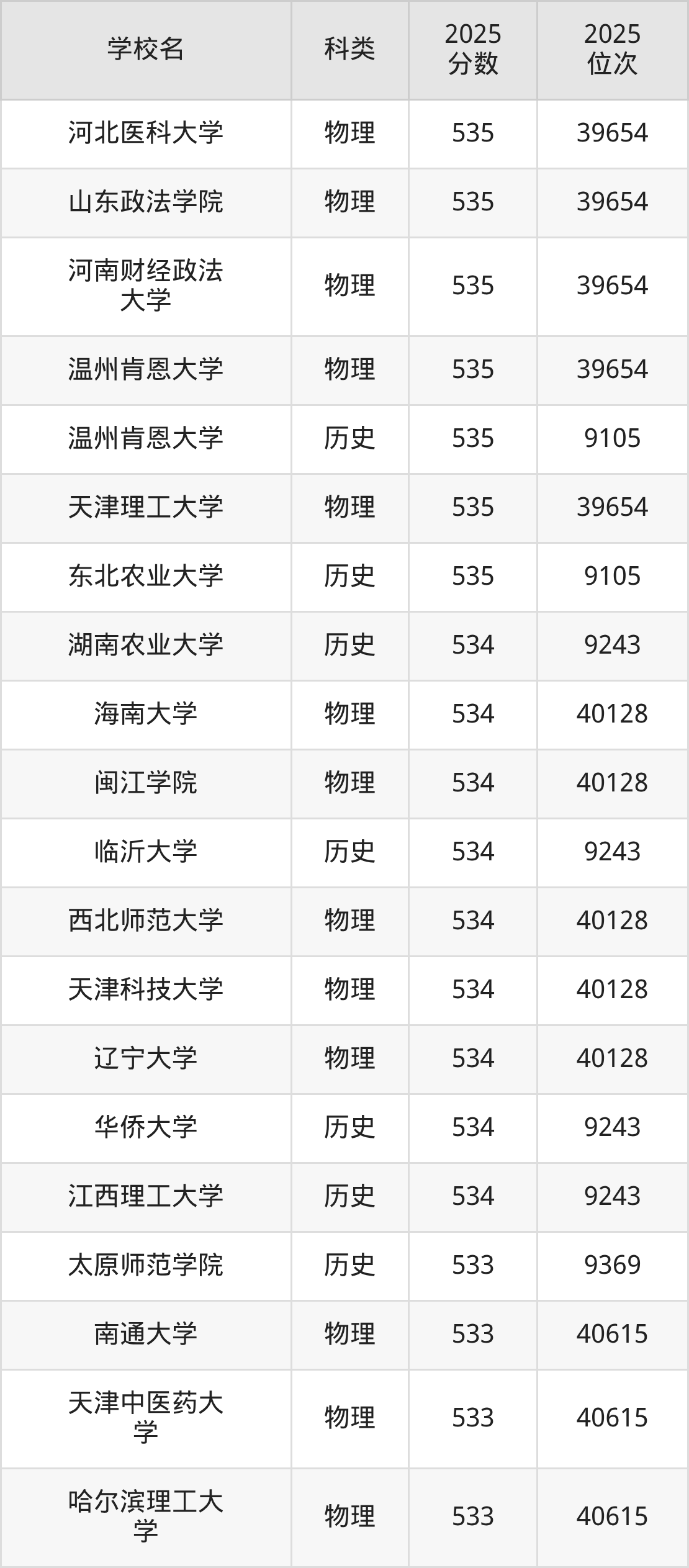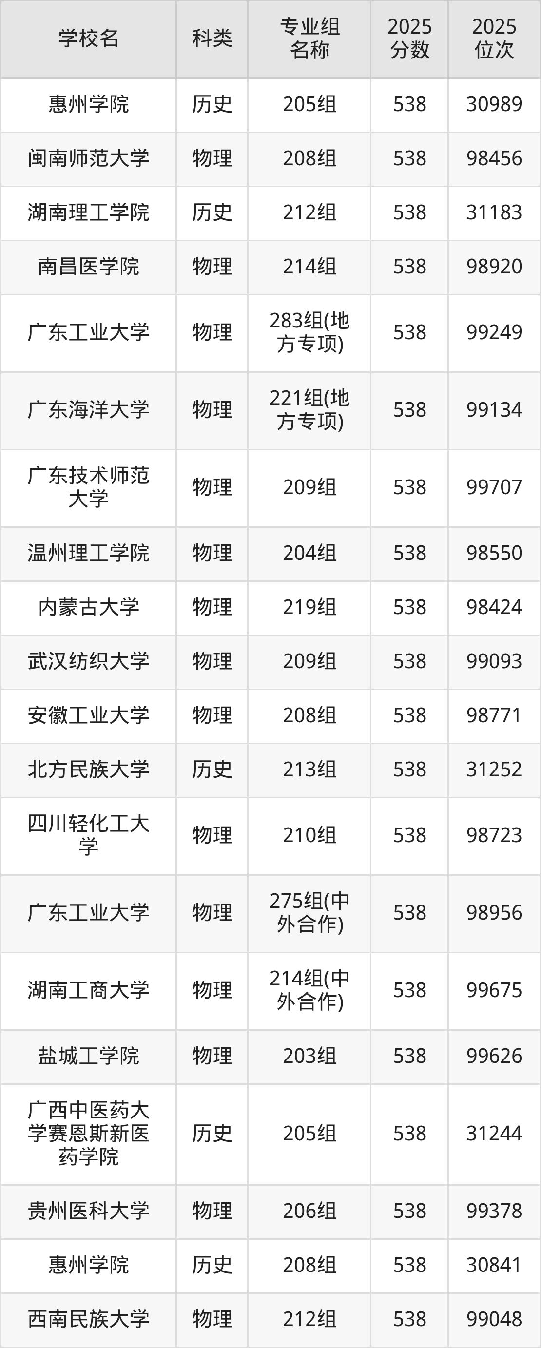 除上述院校外,538分可上的公办本科大学还有九江学院(第002组434分,位次56148名)、温州医科大学(第001组535分,位次20920名)。