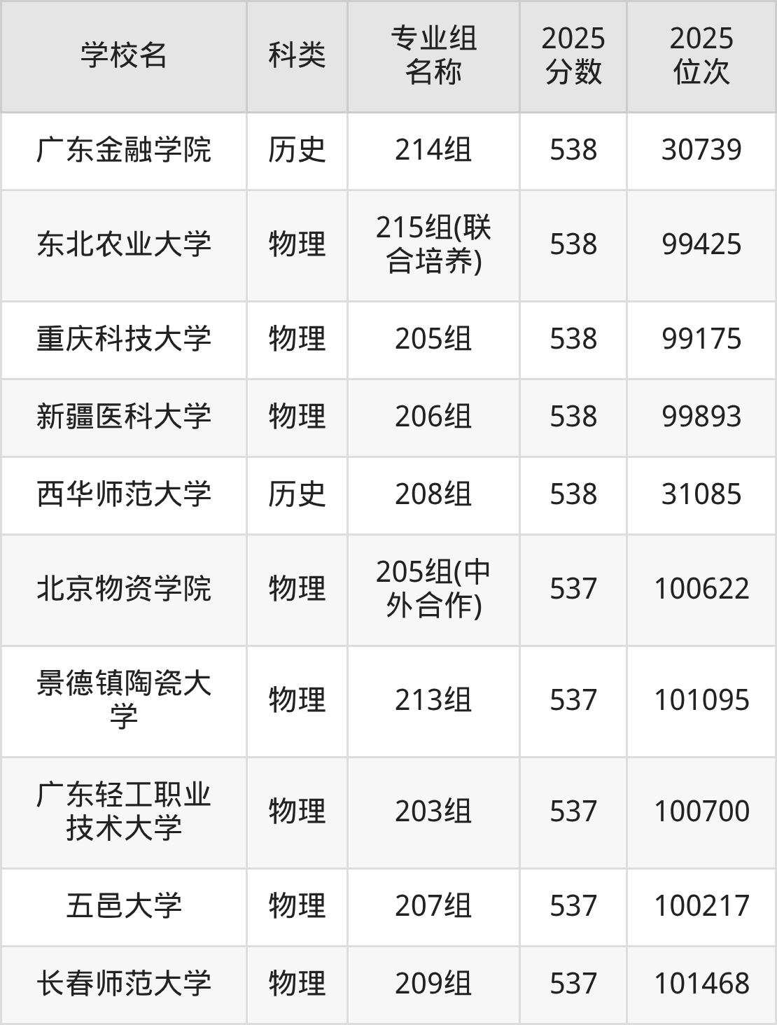 2025年广东历史类本科线为464分,538分能上的本科大学共计497所,其中公办大学录取位次排名最低的是琼台师范学院(214组(中外合作)483分),其2025最低位次为73212名。