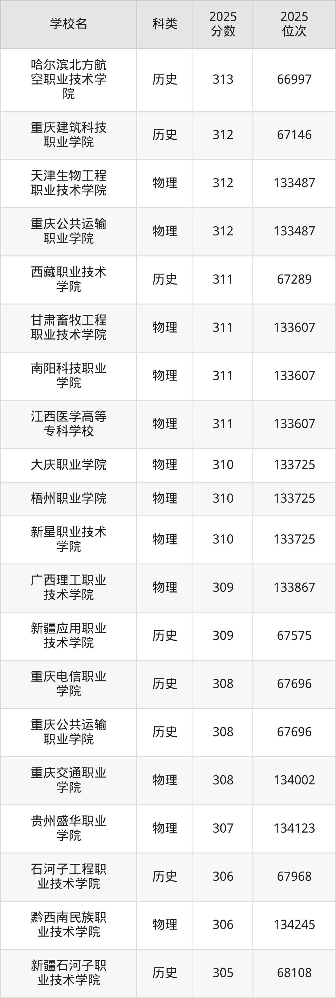 2025年重庆历史类专科线为180分,320分能上的专科学校共计121所,其中最低分公办院校为苏州百年职业学院(180分),对应最低位次为73373名。因此想上公办专科的考生市排名位次至少要在73373名以内。