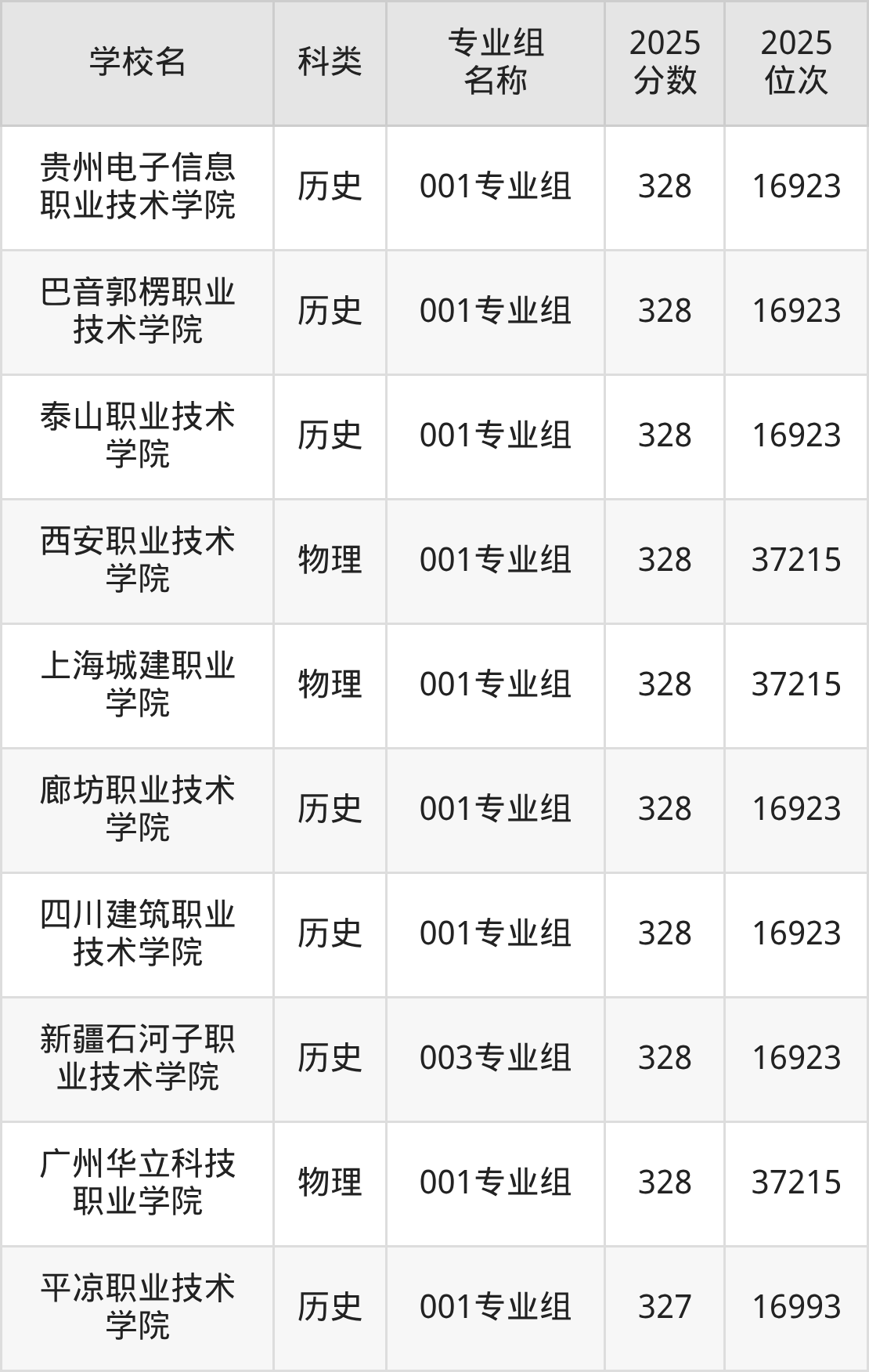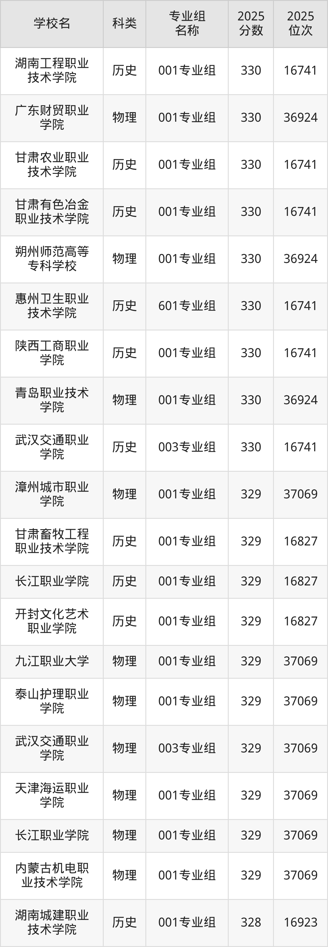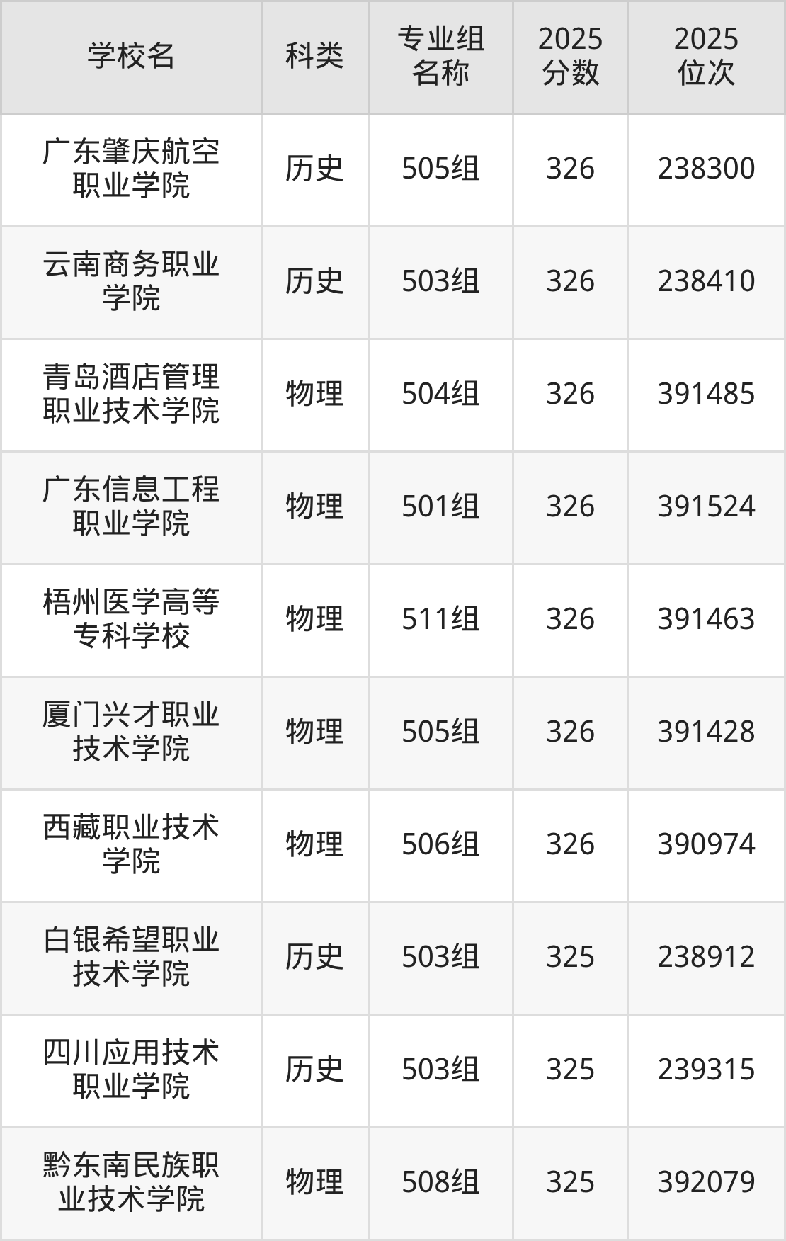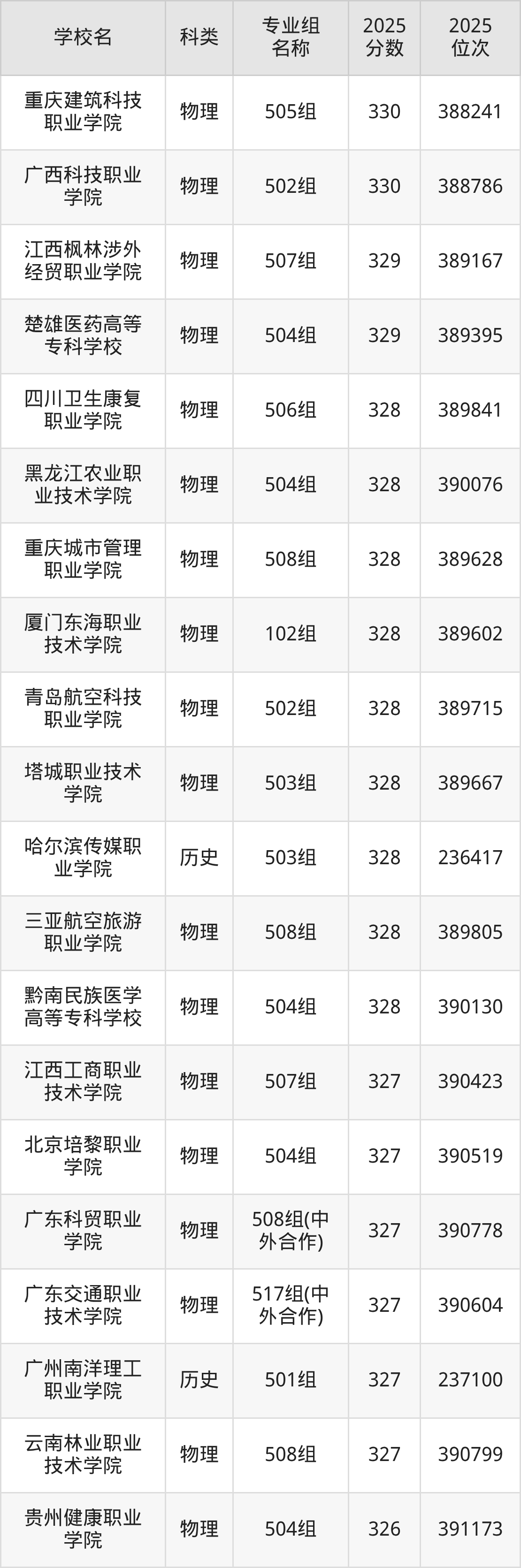 除上述院校外,332分可上的公办专科学校还有青岛酒店管理职业技术学院(504组326分,位次391485名)、塔城职业技术学院(503组328分,位次389667名)。