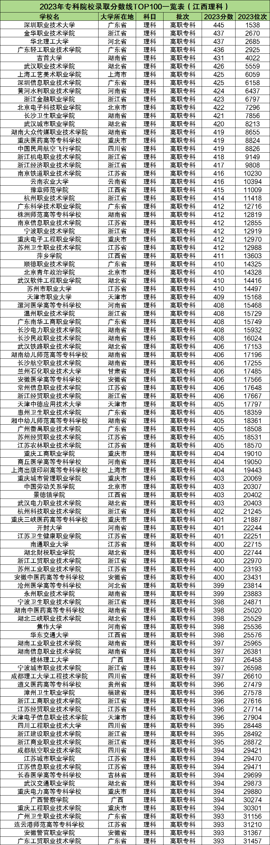 以下是2023年专科院校在江西省理科的录取分数线TOP100一览表: