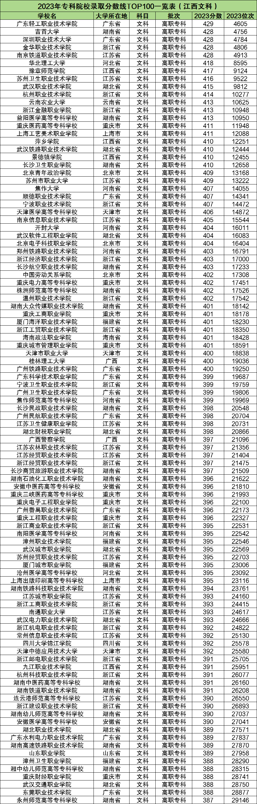 以下是2023年专科院校在江西省文科的录取分数线TOP100一览表:
