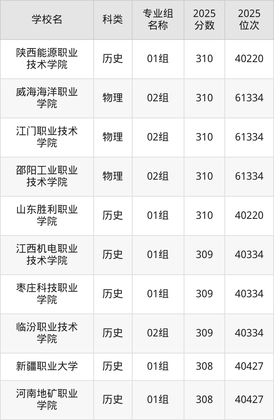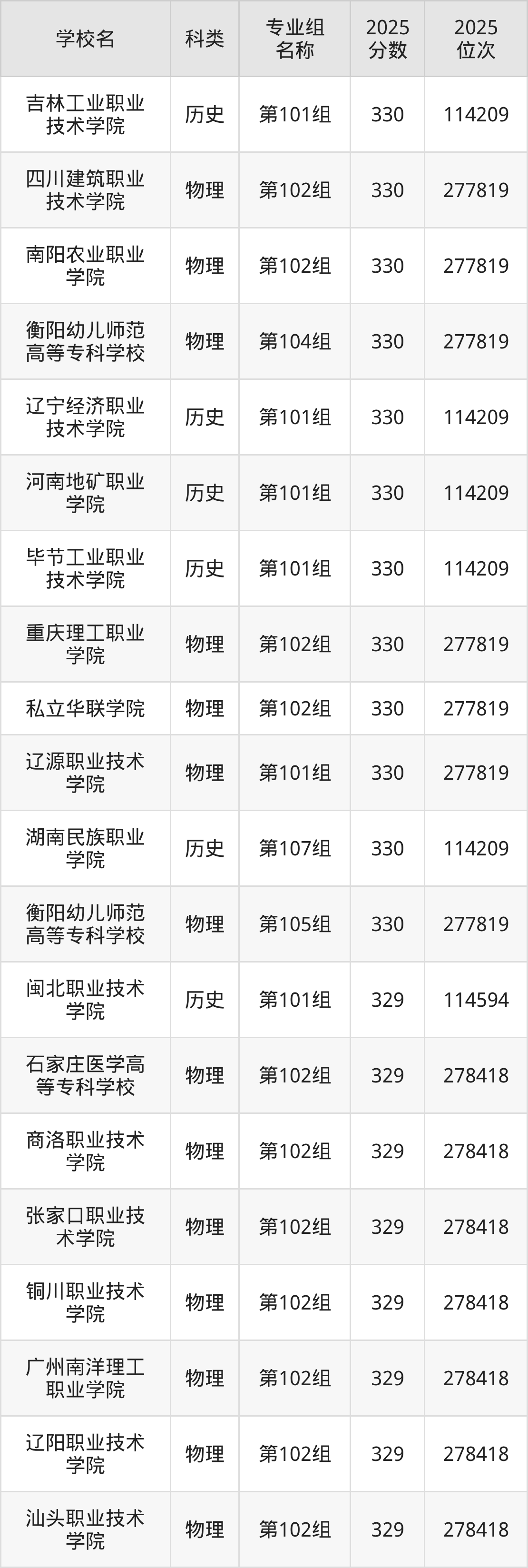 2025年湖南物理类专科线为200分,330分能上的专科学校共计182所,其中公办大学录取位次排名最低的是福州墨尔本理工职业学院(第101组263分),其2025最低位次为307258名。