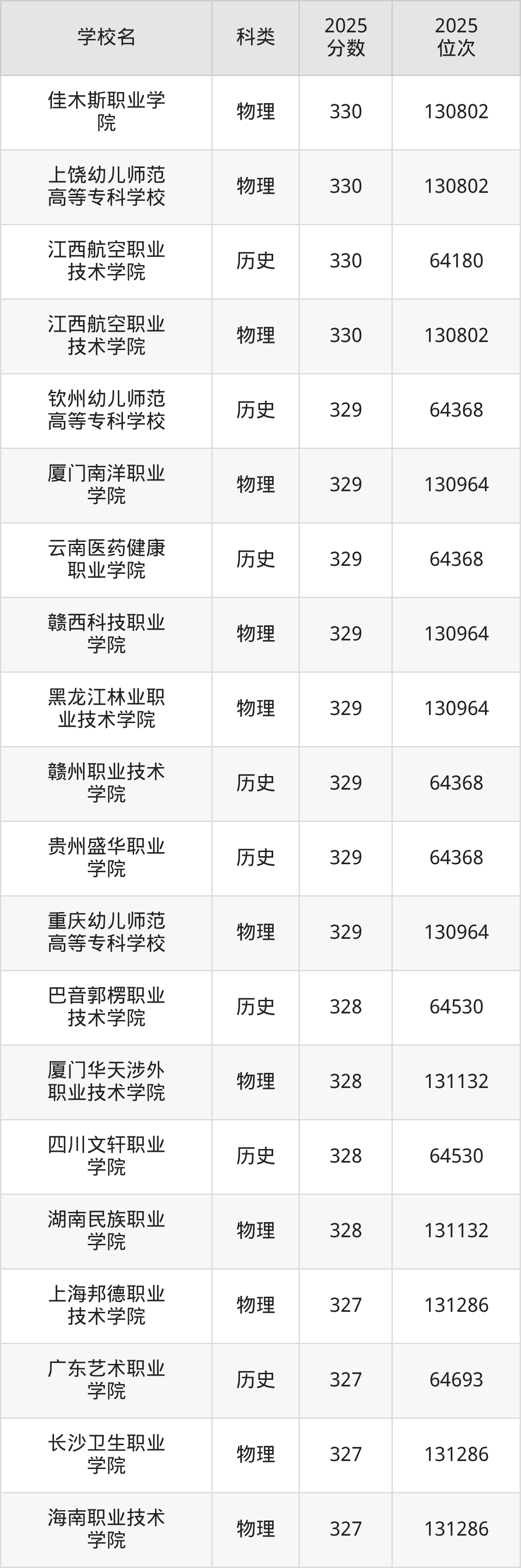 本文将收集各省330分能上的专科学校位次排名表(不含特殊招生计划、中外合作、分校区等),以供2026届考生参考。