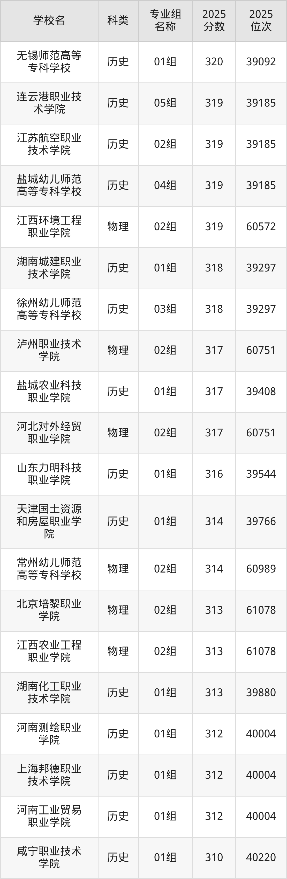 除上述院校外,330分可上的公办专科学校还有盐城农业科技职业学院(01组317分,位次39408名)、河南工业贸易职业学院(01组312分,位次40004名)。