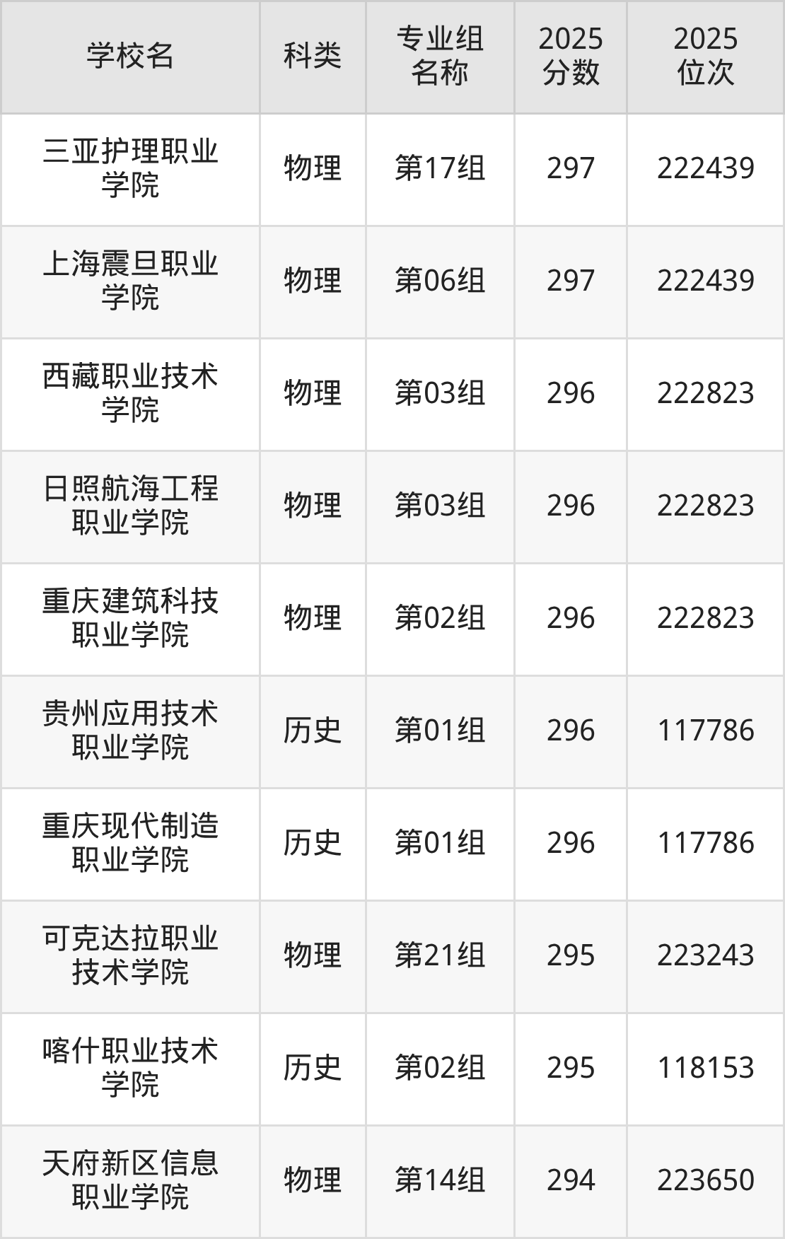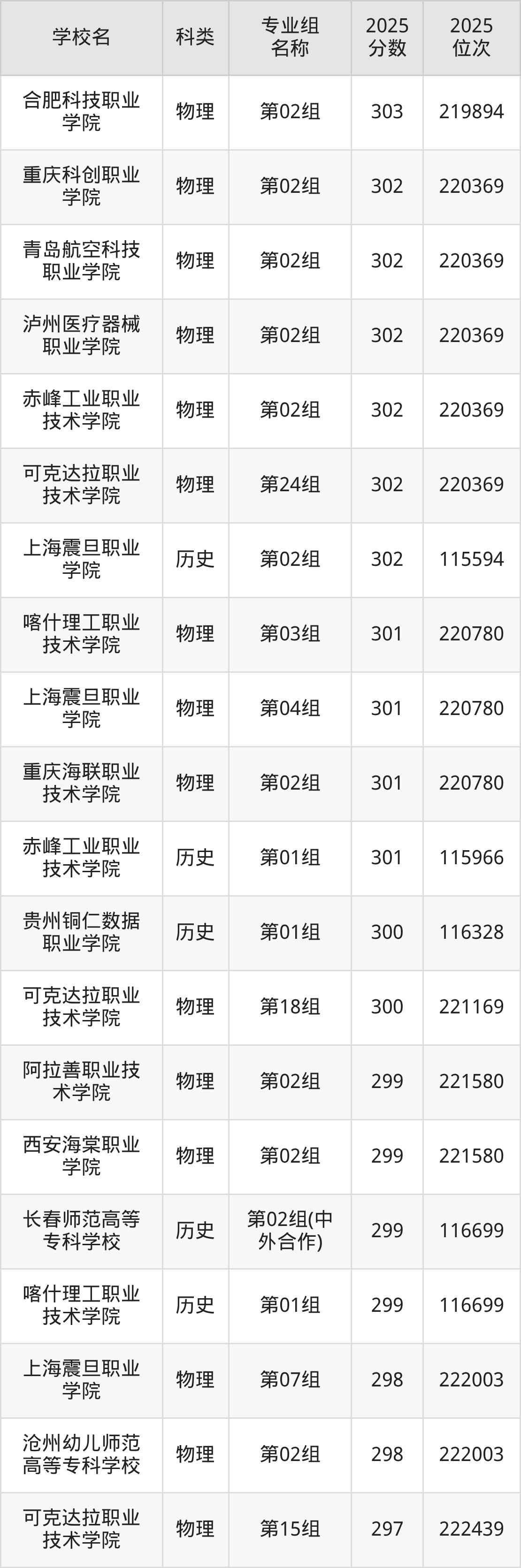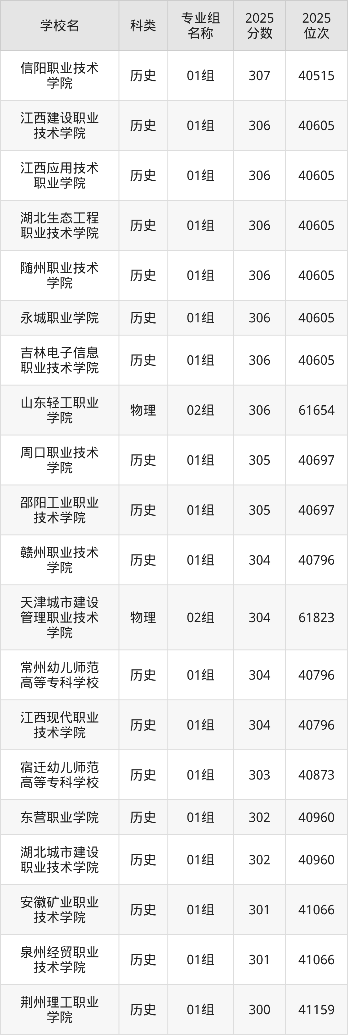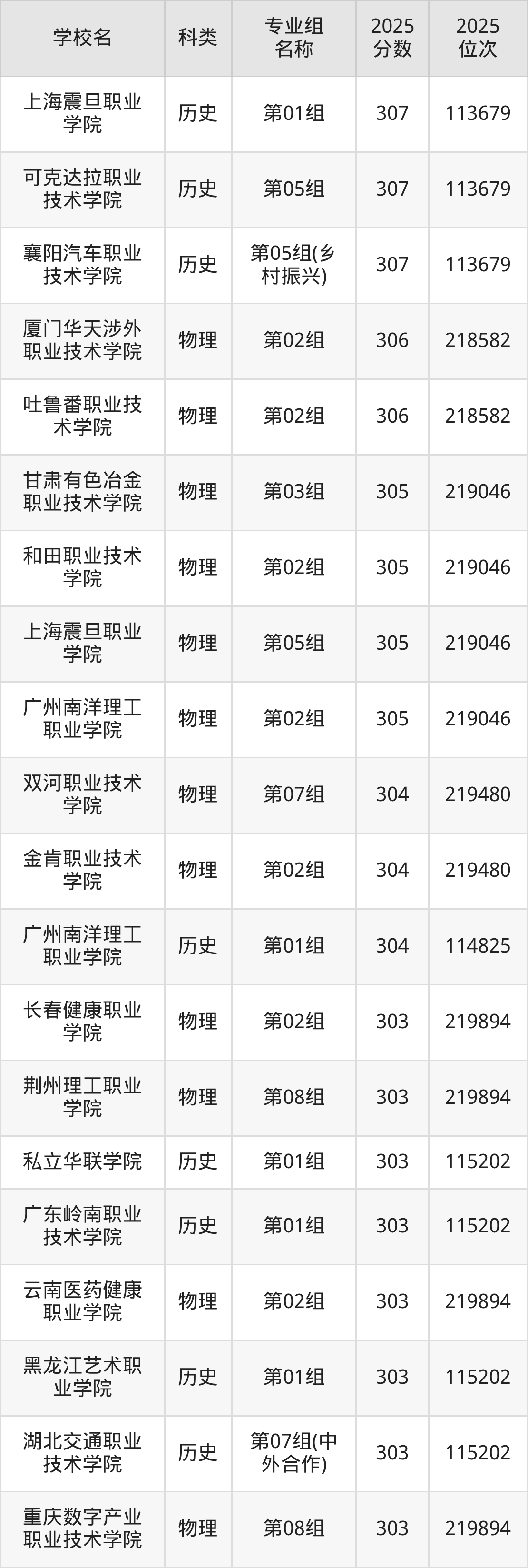 除上述院校外,307分可上的公办专科学校还有贵州电子信息职业技术学院(第01组285分,位次121519名)、长春金融高等专科学校(第01组259分,位次128485名)。