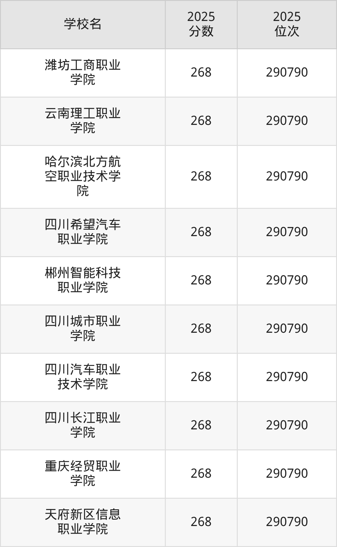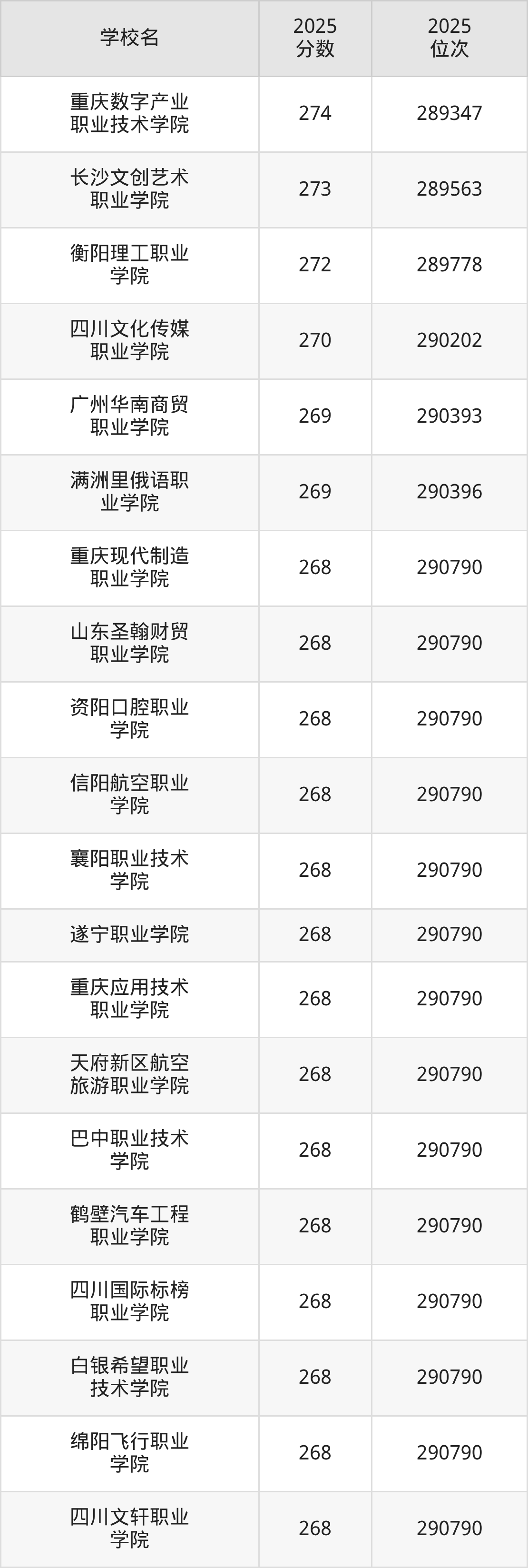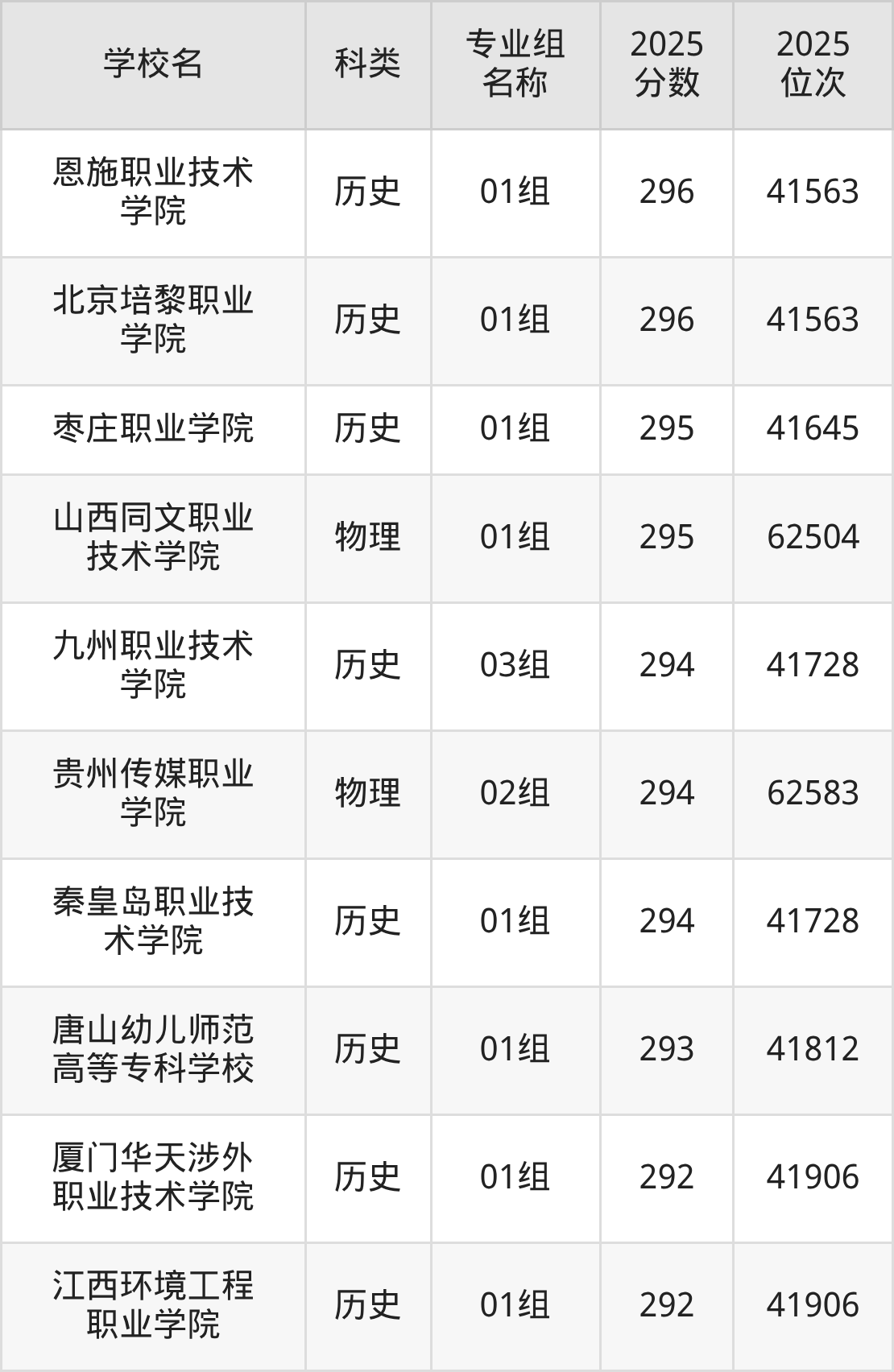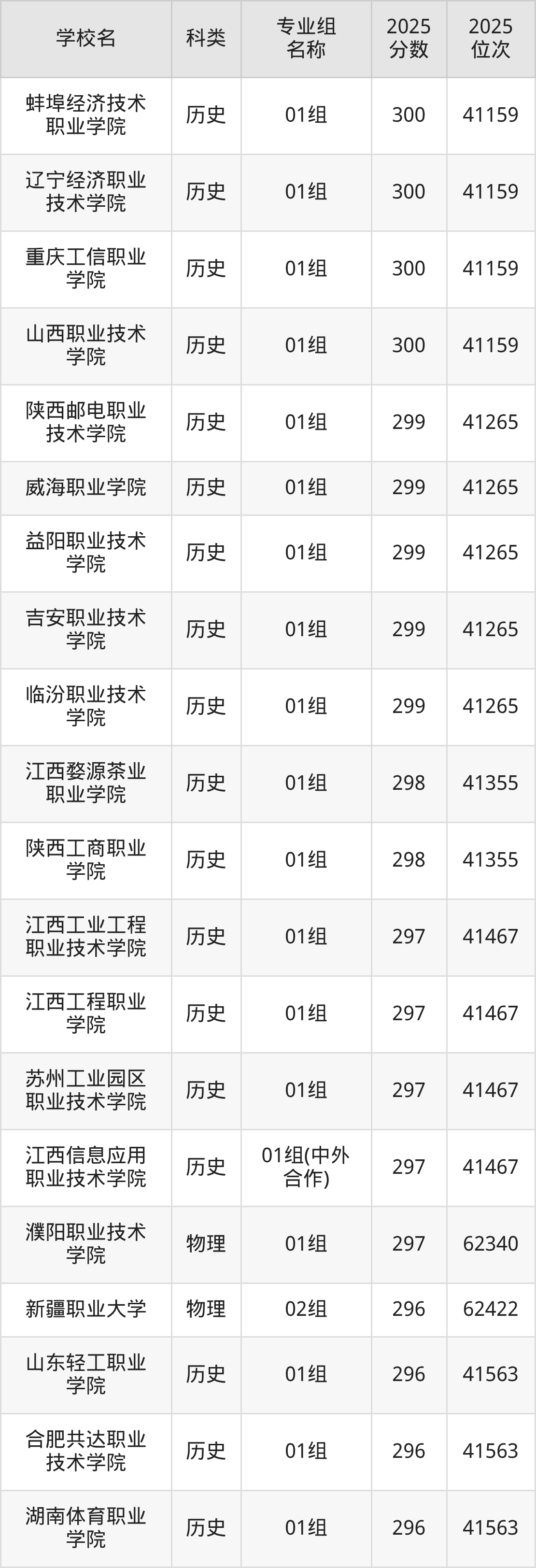 除上述院校外,307分可上的公办专科学校还有贵州电子信息职业技术学院(第01组285分,位次121519名)、长春金融高等专科学校(第01组259分,位次128485名)。