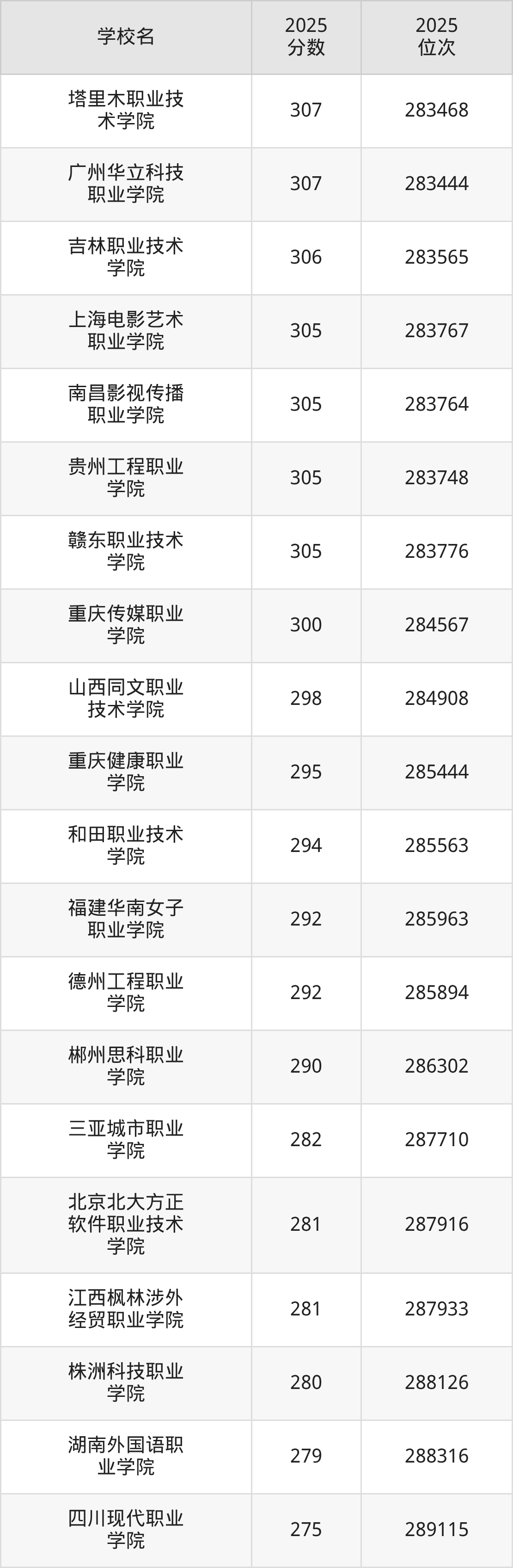 本文将收集各省307分能上的专科学校位次排名表(不含特殊招生计划、中外合作、分校区等),以供2026届考生参考。