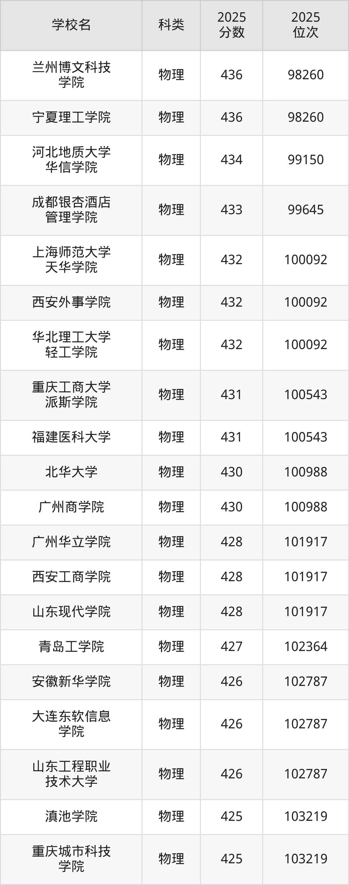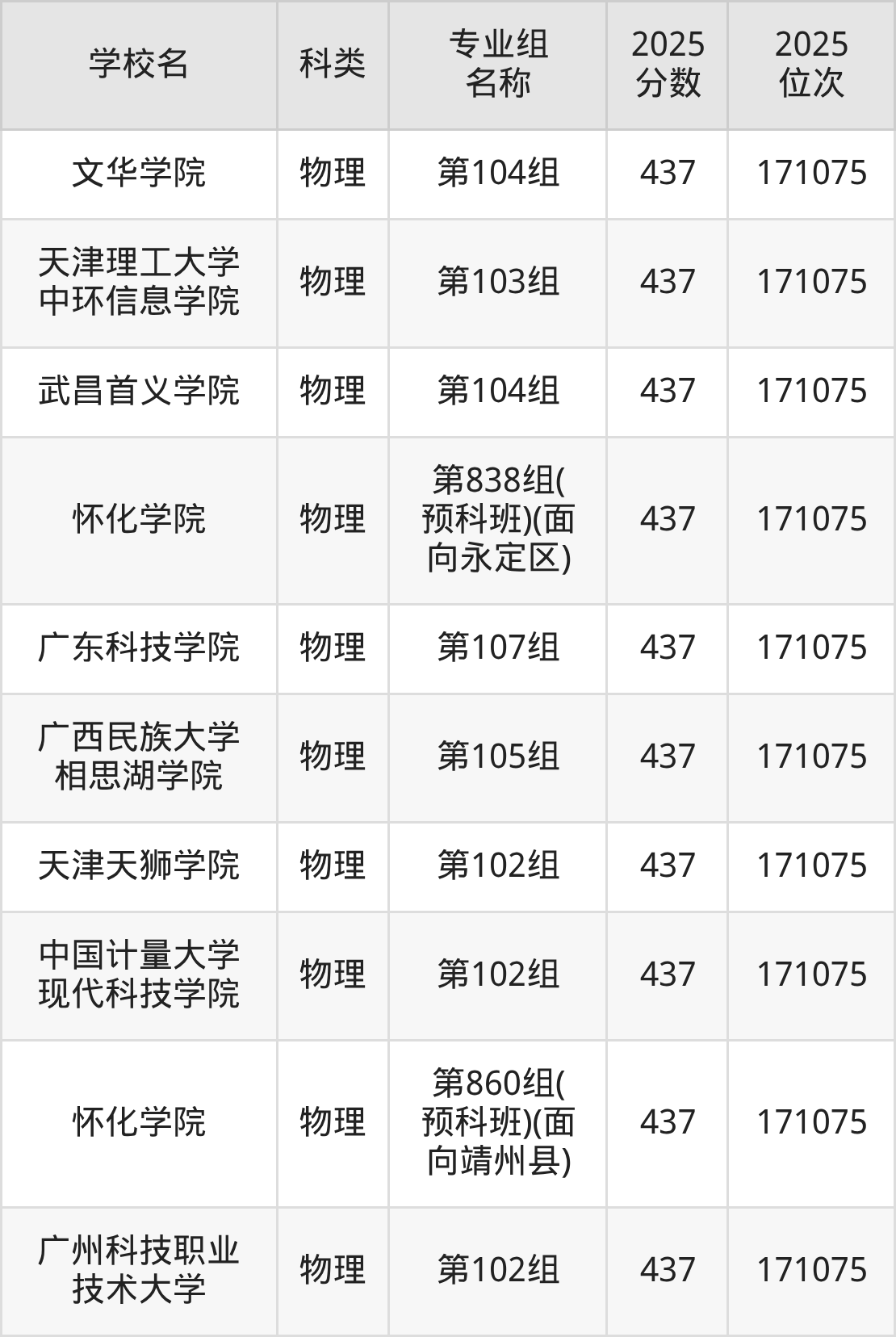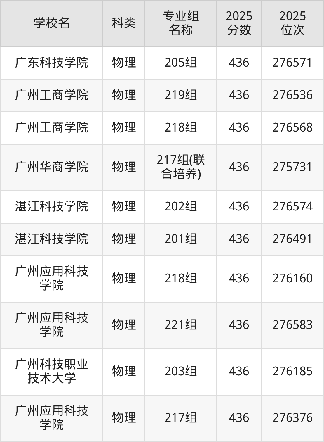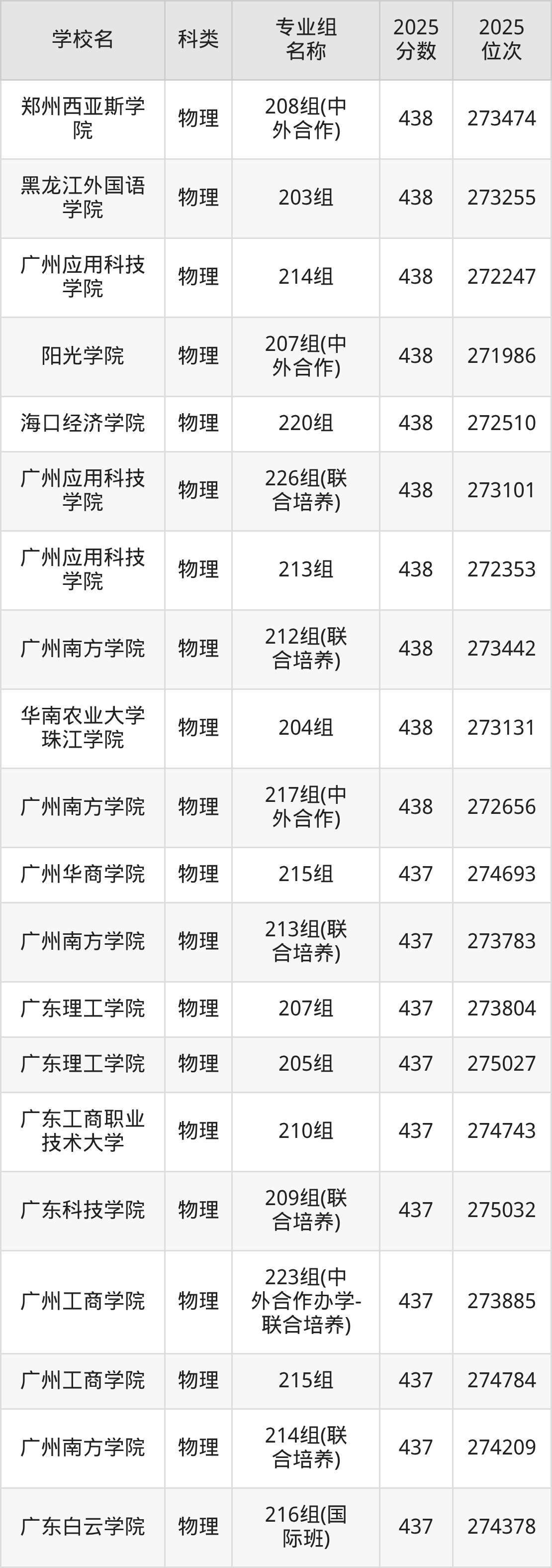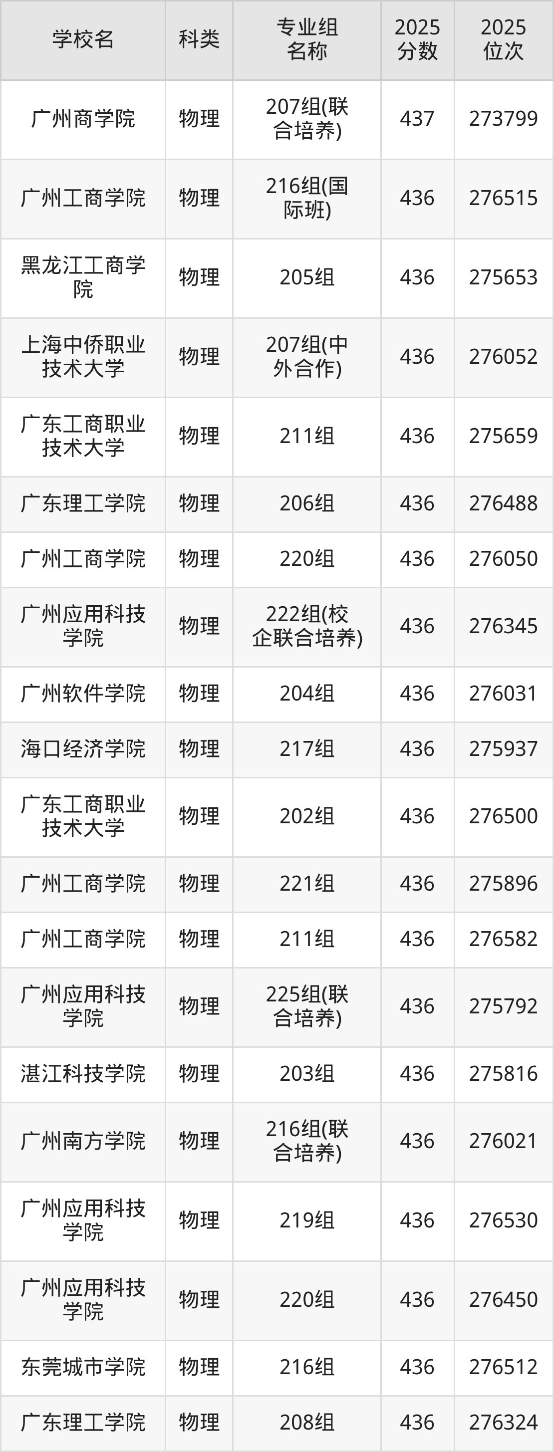 2025年广东物理类本科线为436分,438分能上的本科大学共计24所,其中民办大学录取位次排名最低的是广州华商学院(211组436分,位次276586名),即代表考生省排名位次在276586名及以内就可以报考民办本科。