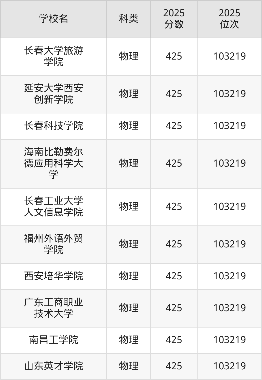 而民办大学录取位次排名最低的是西安翻译学院(425分),其2025最低位次为103219名。